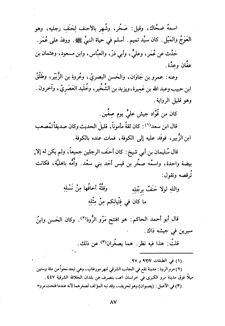 وَشُهِرَ بِالأَحْنَفِ؛ لِحَنَفِ رِجْلَيْهِ، وَهُوَ العَوَجُ وَالمَيْلُ.