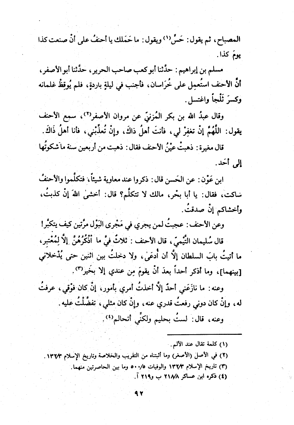 أَنَّ الأَحْنَفَ اسْتُعْمِلَ عَلَى خُرَاسَانَ، فَأَجْنَبَ فِي لَيْلَةٍ بَارِدَةٍ، فَلَمْ يُوْقِظْ غِلْمَانَهُ، وَكَسَرَ ثَلْجاً، وَاغْتَسَلَ.