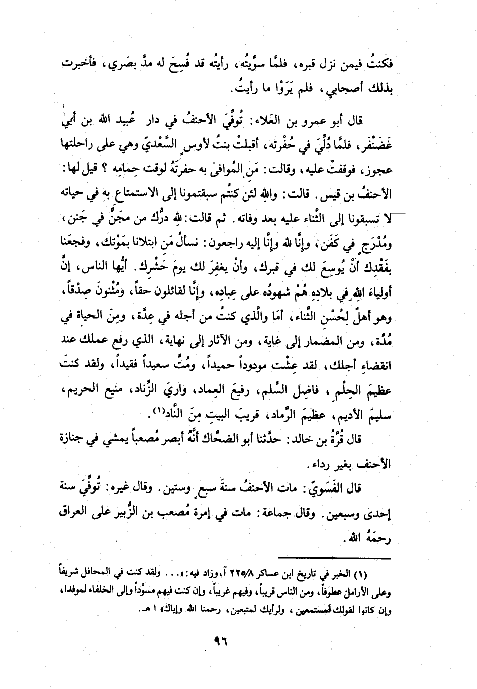 (1) الخبر في تاريخ ابن عساكر 8 / 225 آ، وزاد فيه: "..ولقد كنت في المحافل شريفا وعلى الأرامل عطوفا، ومن الناس قريبا، وفيهم غريبا، وإن كنت فيهم مسودا وإلى الخلفاء لموفدا، وإن كانوا لقولك لمستمعين، ولرأيك لمتبعين، رحمنا الله وإياك " اه.