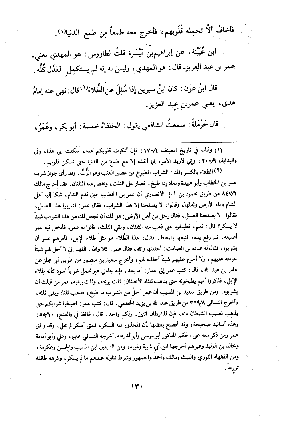ومن طريق سعيد بن المسيب أن عمر أحل من الشراب ما طبخ، فذهب ثلثاه وبقي ثلثه، وأخرج النسائي 8 / 329 من طريق عبد الله بن يزيد الخطمي، قال: كتب عمر: اطبخوا شرابكم حتى يذهب نصيب الشيطان منه، فإن للشيطان اثنين، ولكم واحد.