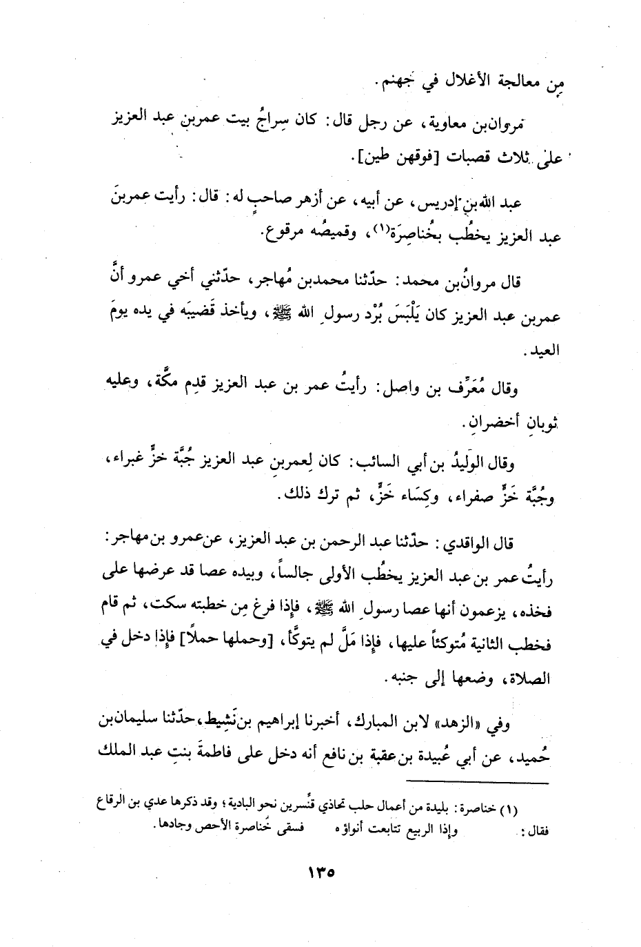 رَأَيْتُ عُمَرَ بنَ عَبْدِ العَزِيْزِ يَخْطُبُ بِخُنَاصِرَةَ (1) ، وَقَمِيْصُهُ مَرْقُوْعٌ.