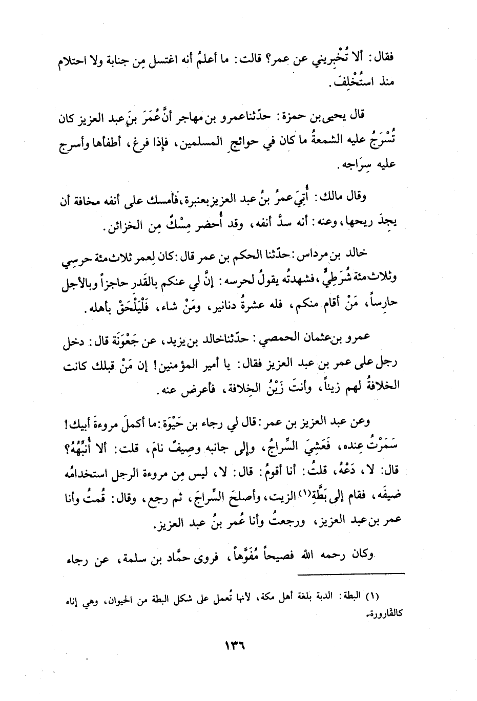 فَقَامَ إِلَى بَطَّةِ (1) الزَّيْتِ، وَأَصْلَحَ السِّرَاجَ، ثُمَّ رَجَعَ، وَقَالَ: قُمْتُ وَأَنَا عُمَرُ بنُ عَبْدِ العَزِيْزِ، وَرَجَعْتُ وَأَنَا عُمَرُ بنُ عَبْدِ العَزِيْزِ.