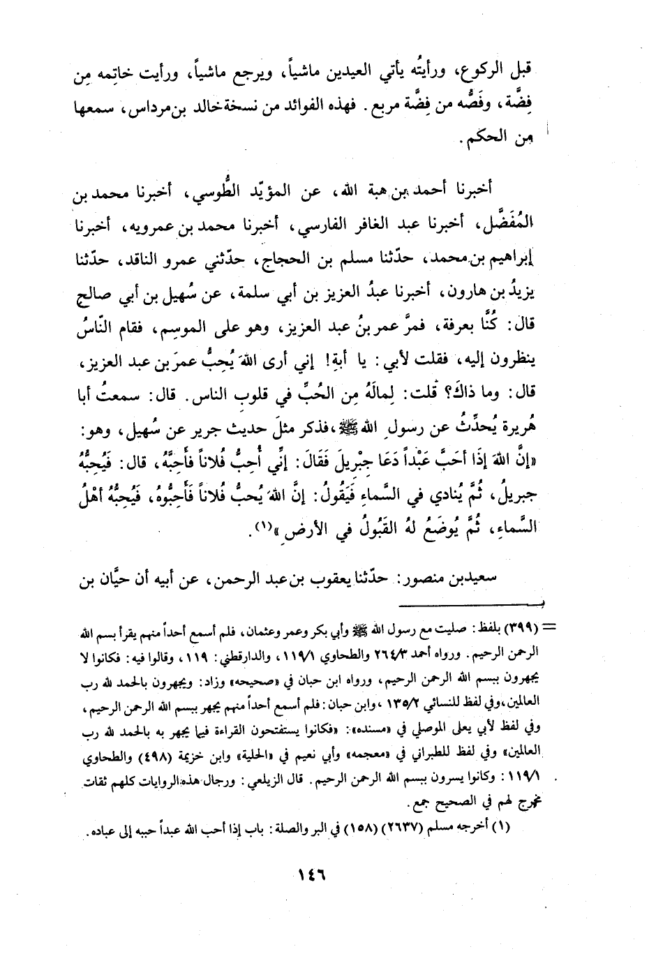 قَالَ: سَمِعْتُ أَبَا هُرَيْرَةَ يُحَدِّثُ عَنْ رَسُوْلِ اللهِ -صَلَّى اللَّهُ عَلَيْهِ وَسَلَّمَ- ... ، فَذَكَرَ مِثْلَ حَدِيْثِ جَرِيْرٍ عَنْ سُهَيْلٍ، وَهُوَ: (إِنَّ اللهَ إِذَا أَحَبَّ عَبْداً، دَعَا جِبْرِيْلَ فَقَالَ: إِنِّي أُحِبُّ فُلاَناً فَأَحِبَّهُ.