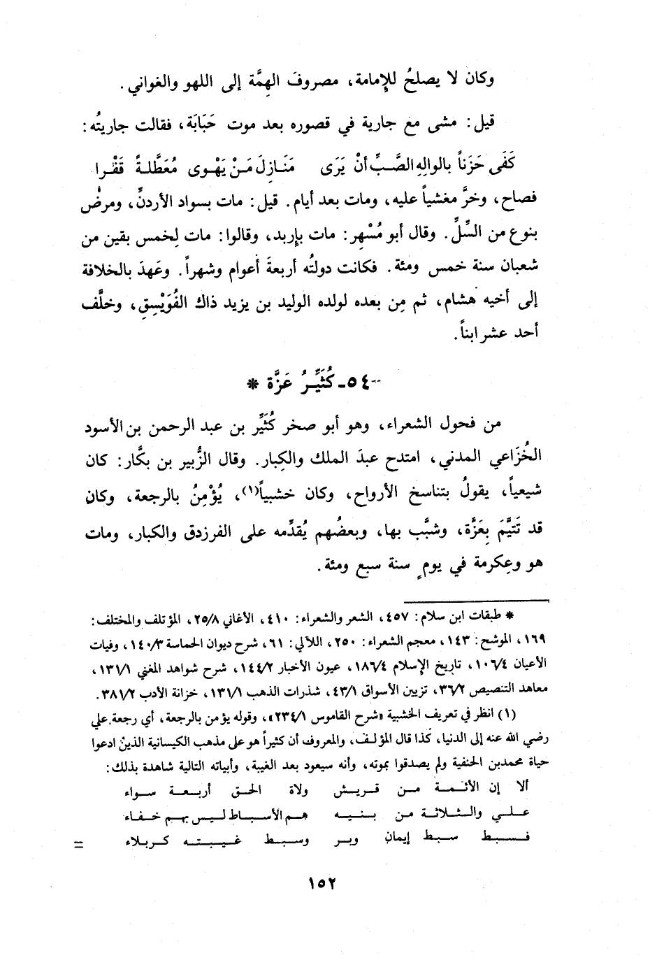 وَقَالَ الزُّبَيْرُ بنُ بَكَّارٍ: كَانَ شِيْعِيّاً، يَقُوْلُ بِتَنَاسُخِ الأَرْوَاحِ، وَكَانَ خَشَبِيّاً (1) ، يُؤْمِنُ بِالرَّجْعَةِ، وَكَانَ قَدْ تَتَيَّمَ بِعَزَّةَ، وَشَبَّبَ بِهَا، وَبَعْضُهُم يُقَدِّمُهُ عَلَى الفَرَزْدَقِ وَالكِبَارِ.