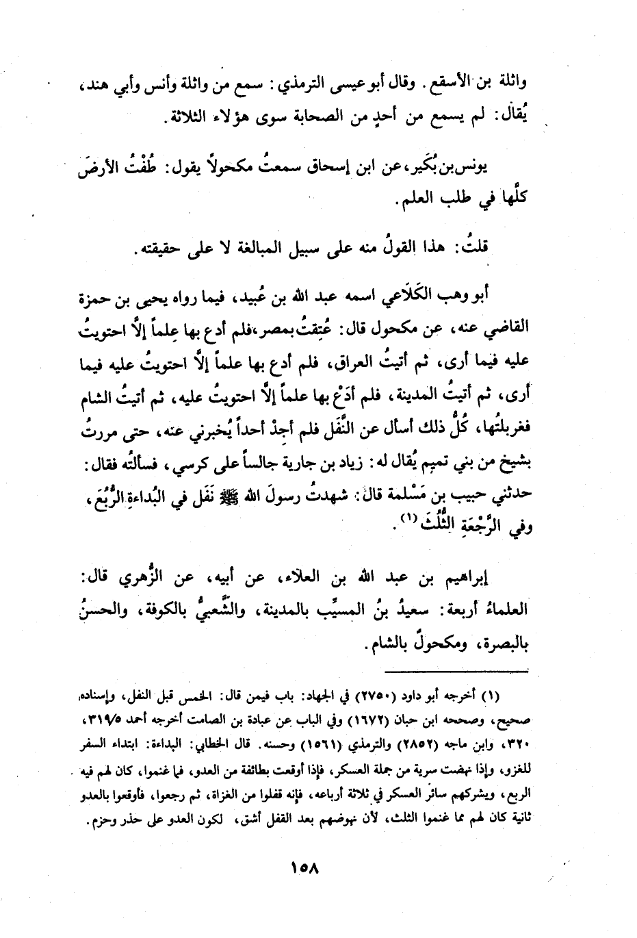 عُتِقْتُ بِمِصْرَ، فَلَمْ أَدَعْ بِهَا عِلْماً إِلاَّ احْتَوَيْتُ عَلَيْهِ فِيْمَا أَرَى، ثُمَّ أَتَيْتُ العِرَاقَ، فَلَمْ أَدَعْ بِهَا عِلْماً إِلاَّ احْتَوَيْتُ عَلَيْهِ فِيْمَا أَرَى، ثُمَّ أَتَيْتُ المَدِيْنَةَ، فَلَمْ أَدَعْ بِهَا عِلْماً إِلاَّ احْتَوَيْتُ عَلَيْهِ، ثُمَّ أَتَيْتُ الشَّامَ، فَغَرْبَلْتُهَا، كُلُّ ذَلِكَ أَسْأَلُ عَنِ النَّفَلِ، فَلَمْ أَجِدْ أَحَداً يُخْبِرُنِي عَنْهُ، حَتَّى مَرَرْتُ بِشَيْخٍ مِنْ بَنِي تَمِيْمٍ يُقَالُ لَهُ: زِيَادُ بنُ جَارِيَةَ جَالِساً عَلَى كُرْسِيٍّ، فَسَأَلْتُهُ.