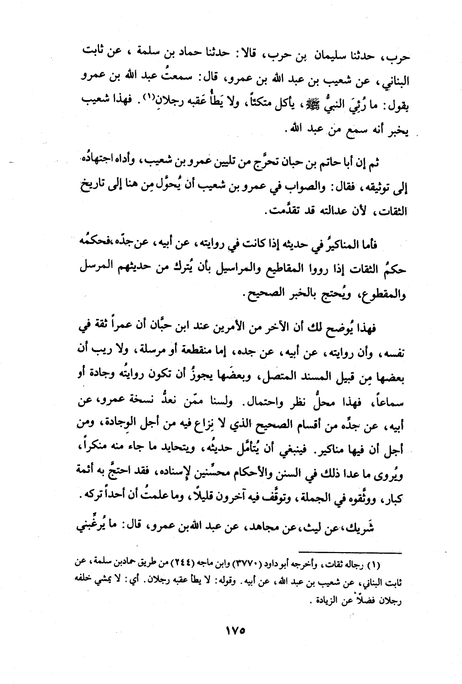 فَهَذَا يُوْضِحُ لَكَ أَنَّ الآخَرَ مِنَ الأَمْرَيْنِ عِنْدَ ابْنِ حِبَّانَ: أَنَّ عَمْراً ثِقَةٌ فِي نَفْسِهِ، وَأَنَّ رِوَايَتَهُ، عَنْ أَبِيْهِ، عَنْ جَدِّهِ، إِمَّا مُنْقَطِعَةٌ أَوْ مُرْسَلَةٌ، وَلاَ رَيْبَ أَنَّ بَعْضَهَا مِنْ قَبِيْلِ المُسْنَدِ المُتَّصِلِ، وَبَعْضُهَا يَجُوْزُ أَنْ تَكُوْنَ رِوَايَتُهُ وِجَادَةً أَوْ سَمَاعاً، فَهَذَا مَحَلُّ نَظَرٍ وَاحْتِمَالٍ.