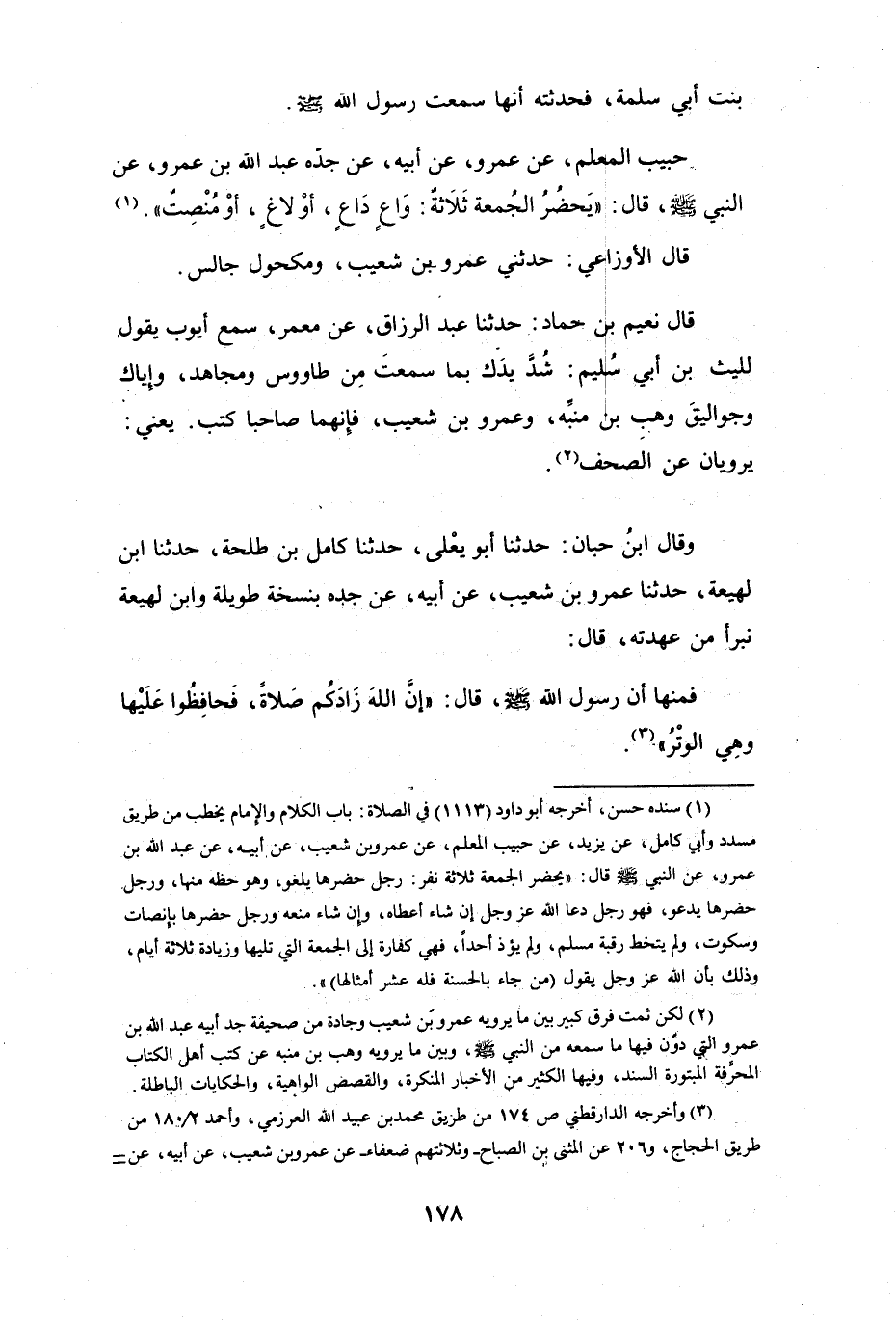 (1) سنده حسن، أخرجه أبو داود (1113) في الصلاة: باب الكلام والامام يخطب من طريق مسدد وأبي كامل، عن يزيد، عن حبيب المعلم، عن عمرو بن شعيب، عن أبيه، عن عبد الله بن عمرو، عن النبي صلى الله عليه وسلم قال: " يحضر الجمعة ثلاثة نفر: رجل حضرها يلغو، وهو حظه منها، ورجل حضرها يدعو، فهو رجل دعا الله عزوجل إن شاء أعطاه، وإن شاء منعه ورجل حضرها بإنصات وسكوت، ولم يتخط رقبة مسلم، ولم يؤذ أحدا، فهي كفارة إلى الجمعة التي تليها وزيادة ثلاثة أيام، وذلك بأن الله عزوجل يقول (من جاء بالحسنة فله عشر أمثالها) ".