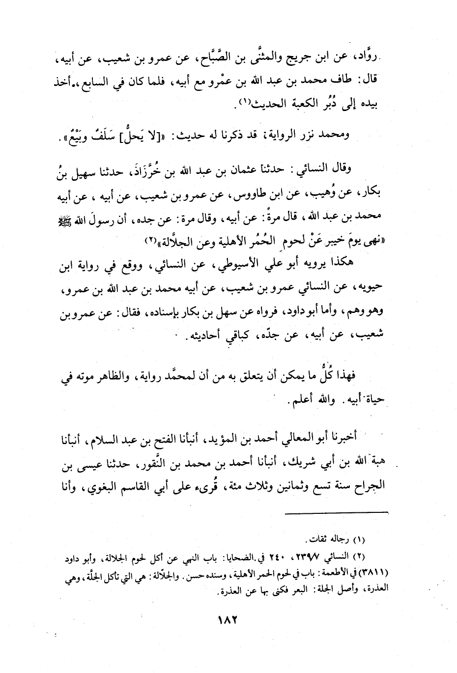 وَقَالَ النَّسَائِيُّ: حَدَّثَنَا عُثْمَانُ بنُ عَبْدِ اللهِ بنِ خُرَّزَاذَ، حَدَّثَنَا سُهَيْلُ بنُ بَكَّارٍ، عَنْ وُهَيْبٍ، عَنِ ابْنِ طَاوُوْسٍ، عَنْ عَمْرِو بنِ شُعَيْبٍ، عَنْ أَبِيْهِ، عَنْ أَبِيْهِ مُحَمَّدِ بنِ عَبْدِ اللهِ - قَالَ مَرَّةً: عَنْ أَبِيْهِ، وَقَالَ مَرَّةً: عَنْ جَدِّهِ -: