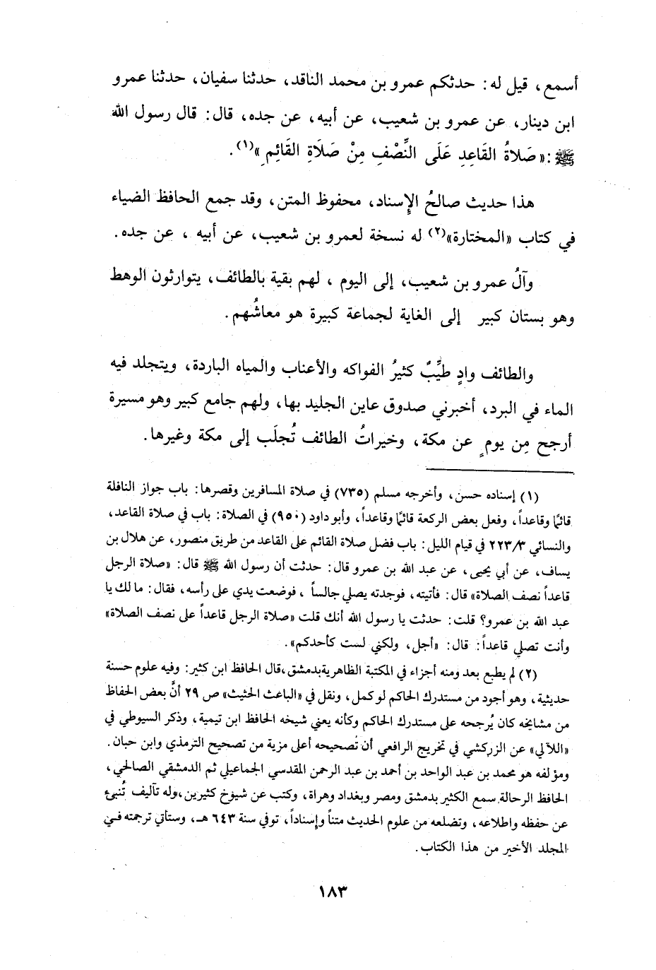 وَالطَّائِفُ: وَادٍ طَيِّبٌ، كَثِيْرُ الفَوَاكِهِ، وَالأَعْنَابِ، وَالمِيَاهِ البَارِدَةِ، وَيَتَجَلَّدُ فِيْهِ المَاءُ فِي البَرْدِ، أَخْبَرَنِي صَدُوْقٌ عَايَنَ الجَلِيْدَ بِهَا، وَلَهُم جَامِعٌ كَبِيْرٌ، وَهُوَ مَسِيْرَةُ أَرْجَحَ مِنْ يَوْمٍ عَنْ مَكَّةَ، وَخَيْرَاتُ الطَّائِفِ تُجْلَبُ إِلَى مَكَّةَ وَغَيْرِهَا.