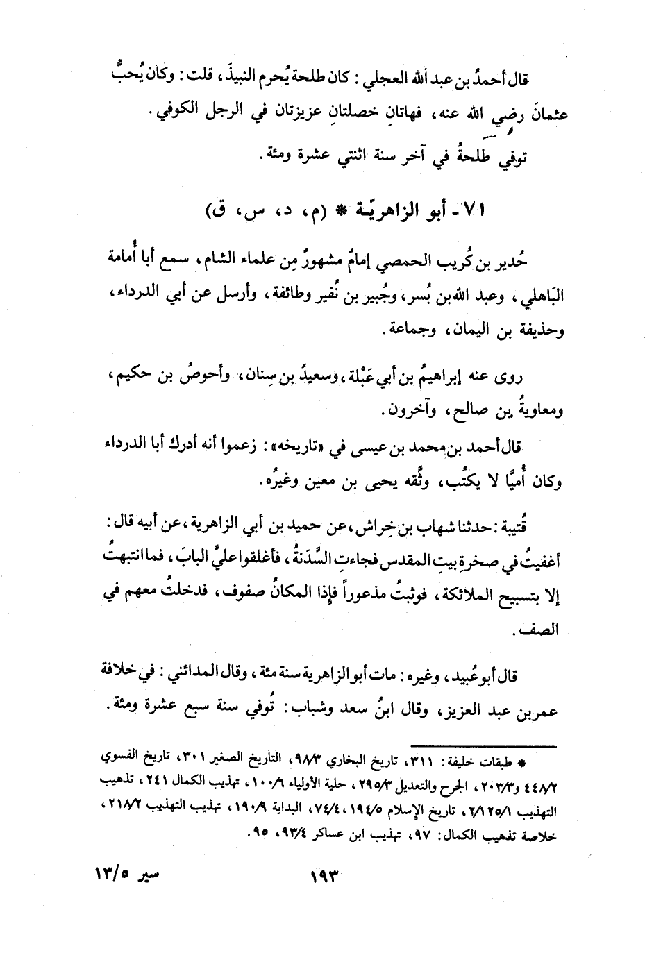 (*) طبقات خليفة: 311، تاريخ البخاري 3 / 98، التاريخ الصغير 301، تاريخ الفسوي 2 / 448 و3 / 203، الجرح والتعديل 3 / 295، حلية الأولياء 6 / 100، تهذيب الكمال 241، تذهيب التهذيب 1 / 125 / 2، تاريخ الإسلام 5 / 194، 4 / 74، البداية 9 / 190، تهذيب التهذيب 2 / 218، خلاصة تذهيب الكمال: 97، تهذيب ابن عساكر 4 / 93، 95.
