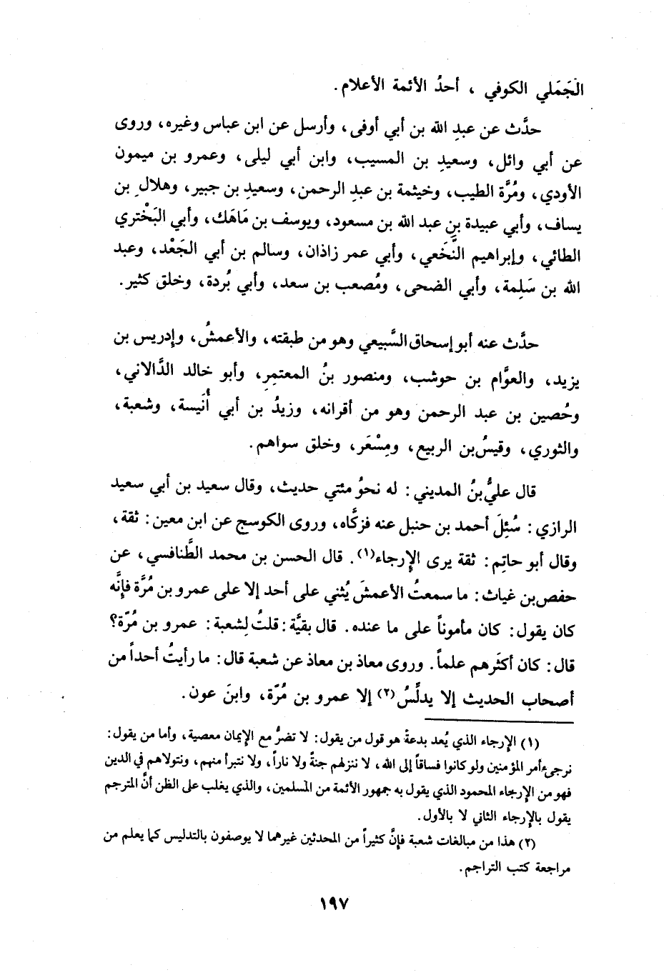 (1) الارجاء الذي يعد بدعة هو قول من يقول: لا تضر مع الايمان معصية، وأما من يقول: نرجئ أمر المؤمنين ولو كانوا فساقا إلى الله، لاننزلهم جنة ولا نارا، ولا نتبرأ منهم، ونتولاهم في الدين فهو من الارجاء المحمود الذي يقول به جمهور الأئمة من المسلمين، والذي يغلب على الظن أن المترجم يقول بالارجاء الثاني لا بالاول.