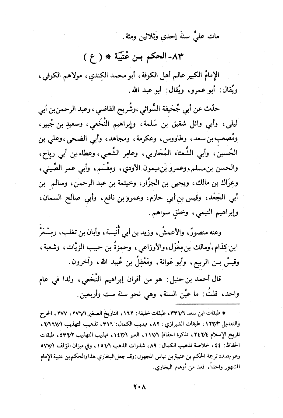 (*) طبقات ابن سعد 6 / 331، طبقات خليفة: 162، التاريخ الصغير 1 / 276، 277، الجرح والتعديل 3 / 123، طبقات الشيرازي: 82، تهذيب الكمال: 316، تذهيب التهذيب 1 / 167 / 2، تاريخ الإسلام 4 / 242، تذكرة الحفاظ 1 / 117، العبر 1 / 143، تهذيب التهذيب 2 / 432، طبقات الحفاظ: 44، خلاصة تذهيب الكمال: 89، شذرات الذهب 1 / 151، وفي ميزان المؤلف 1 / 577 وهو بصدد ترجمة الحكم بن عتيبة بن نهاس المجهول: وقد جعل البخاري هذا والحكم بن عتيبة الامام المشهور واحدا، فعد من أوهام البخاري.