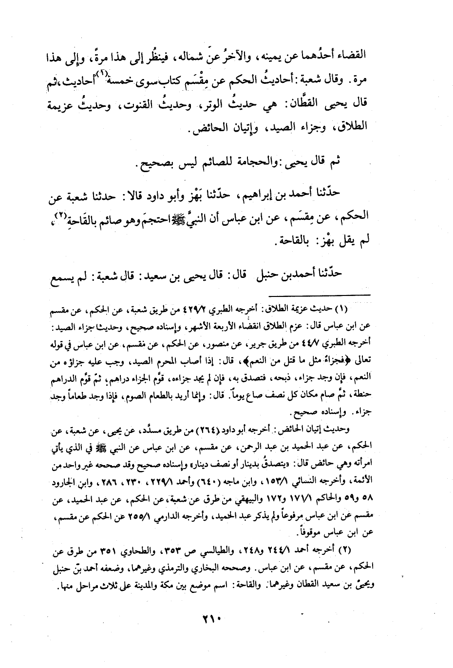 (1) حديث عزيمة الطلاق: أخرجه الطبري 2 / 429 من طريق شعبة، عن الحكم، عن مقسم عن ابن عباس قال: عزم الطلاق انقضاء الأربعة الاشهر، وإسناده صحيح، وحديث اجزاء الصيد: أخرجه الطبري 7 / 44 من طريق جرير، عن منصور، عن الحكم، عن مقسم، عن ابن عباس في قوله تعالى (فجزاء مثل ما قتل من النعم) ، قال: إذا أصاب المحرم الصيد، وجب عليه جزاؤه من النعم، فإن وجد جزاء، ذبحه، فتصدق به، فإن لم يجد جزاءه، قوم الجزاء دراهم، ثم قوم الدراهم حنطة، ثم صام مكان كل نصف صاع يوما.