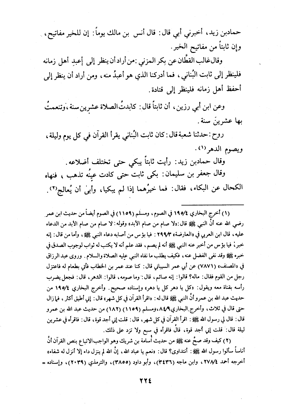 كَانَ ثَابِتٌ البُنَانِيُّ يَقْرَأُ القُرْآنَ فِي كُلِّ يَوْمٍ وَلَيْلَةٍ، وَيَصُوْمُ الدَّهْرَ (1) .