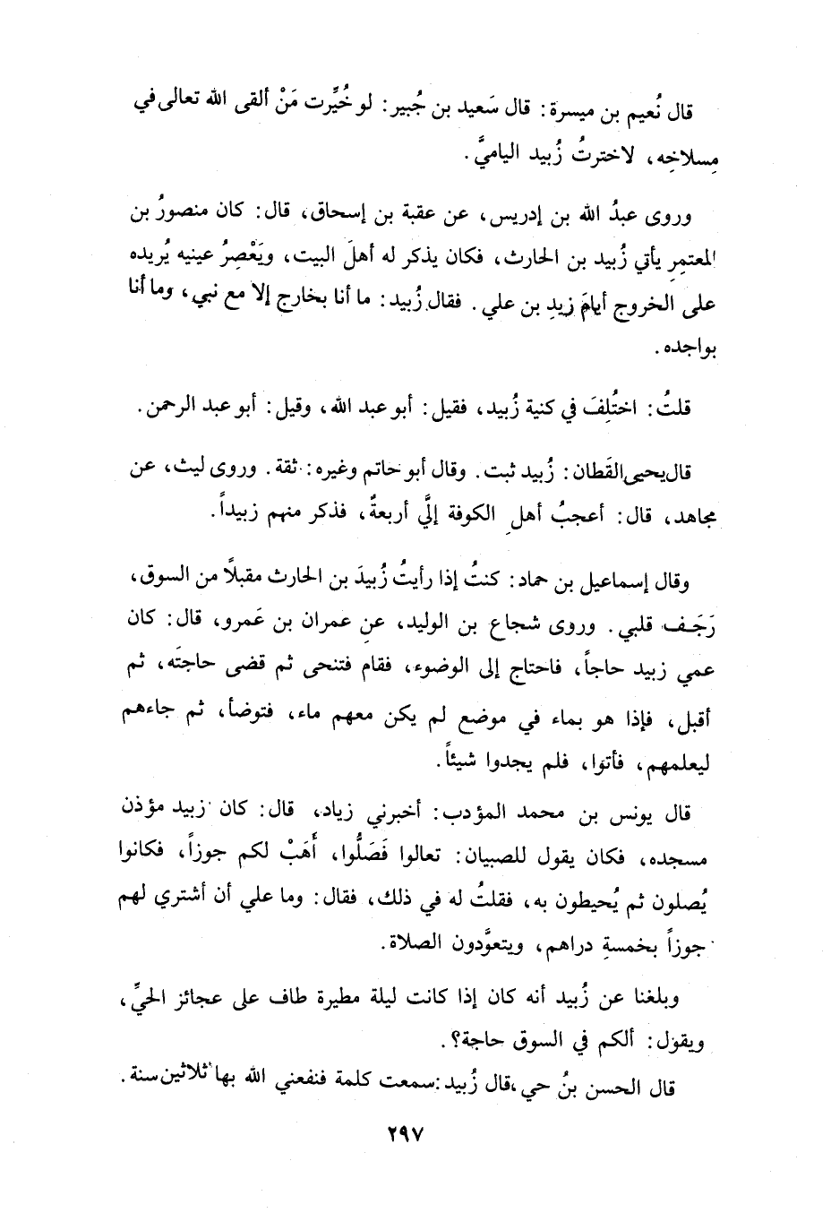 وَقَالَ إِسْمَاعِيْلُ بنُ حَمَّادٍ: كُنْتُ إِذَا رَأَيْتُ زُبَيْدَ بنَ الحَارِثِ مُقْبِلاً مِنَ السُّوْقِ، رَجَفَ قَلْبِي.