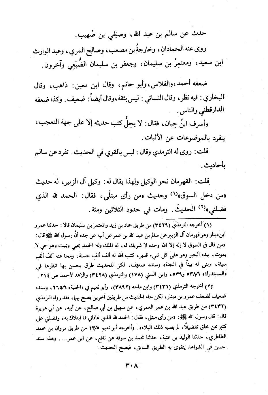 (2) أخرجه الترمذي (3431) وابن ماجه (3892) ، وأبو نعيم في " الحلية " 6 / 265، وسنده ضعيف لضعف عمرو بن دينار، لكن جاء الحديث من طريقين آخرين يصح بهما، فقد رواه الترمذي (3432) من طريق عبد الله بن عمر العمري، عن سهيل بن أبي صالح، عن أبيه، عن أبي هريرة قال: قال رسول الله صلى الله عليه وسلم " " من رأى مبتلى، فقال: الحمدلله الذي عافاني مما ابتلاك به، وفضلني على كثير ممن خلق تفضيلا، لم يصبه ذلك البلاء ".