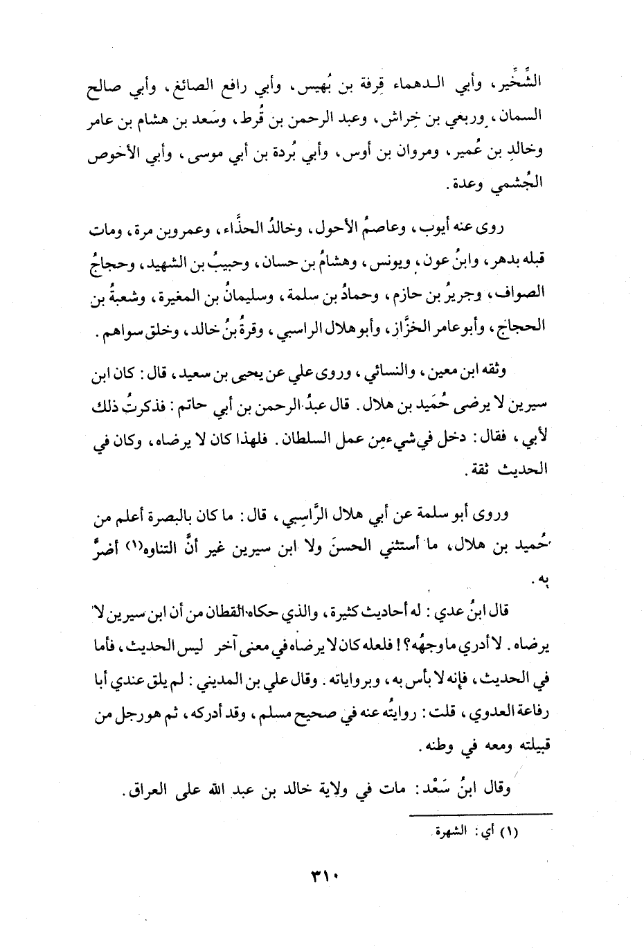 كَانَ ابْنُ سِيْرِيْنَ لاَ يَرضَى حُمَيْدَ بنَ هِلاَلٍ.