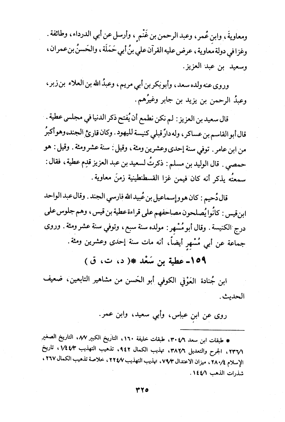 قَالَ الوَلِيْدُ بنُ مُسْلِمٍ: ذَكَرتُ لِسَعِيْدِ بنِ عَبْدِ العَزِيْزِ قِدَمَ عَطِيَّةَ، فَقَالَ: