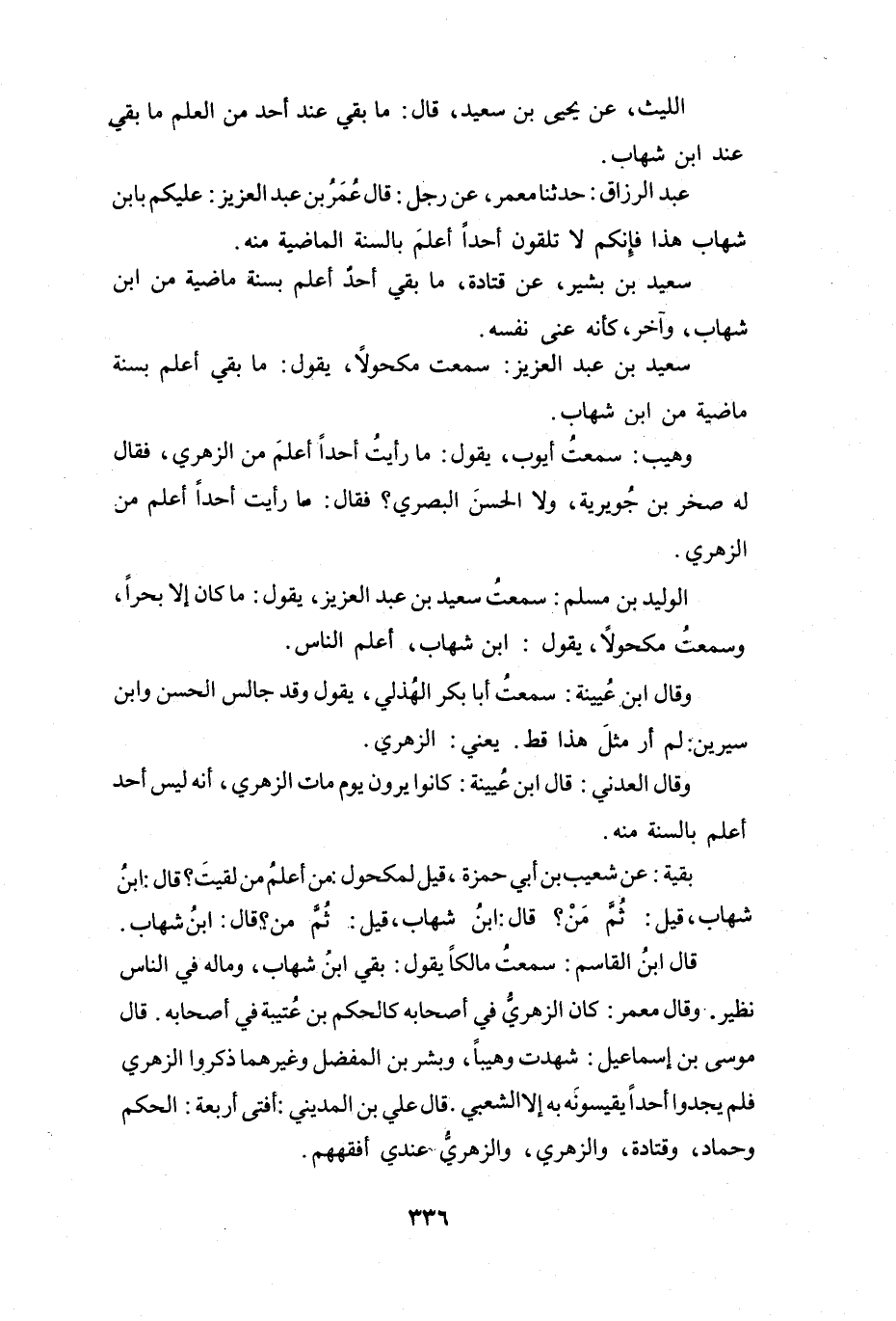 مَا بَقِيَ أَحَدٌ أَعْلَمَ بِسُنَّةٍ مَاضِيَةٍ مِنِ ابْنِ شِهَابٍ وَآخَرُ - كَأَنَّهُ عَنَى نَفْسَه -.
