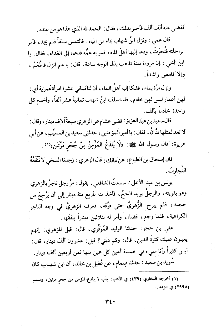 مرَّ رَجُلٌ تَاجِرٌ بِالزُّهْرِيِّ وَهُوَ بِقَرْيَتِه، وَالرَّجُلُ يُرِيْدُ الحَجَّ، فَأَخَذَ مِنْهُ بِأَرْبَعِ مائَةِ دِيْنَارٍ إِلَى أَنْ يَرْجِعَ مِنْ حَجِّهِ، فَلَمْ يَبرَحِ الزُّهْرِيُّ حَتَّى فَرَّقَه، فَعَرَفَ الزُّهْرِيُّ فِي وَجْهِ التَّاجِرِ الكَرَاهِيَةَ.