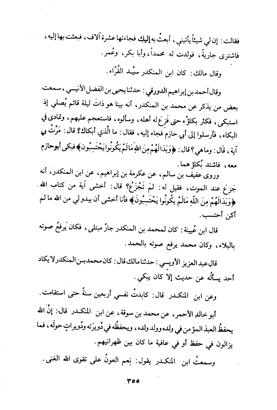 كَانَ مُحَمَّدُ بنُ المُنْكَدِرِ لاَ يَكَادُ أَحَدٌ يَسْأَلُه عَنْ حَدِيْثٍ، إِلاَّ كَانَ يَبْكِي.