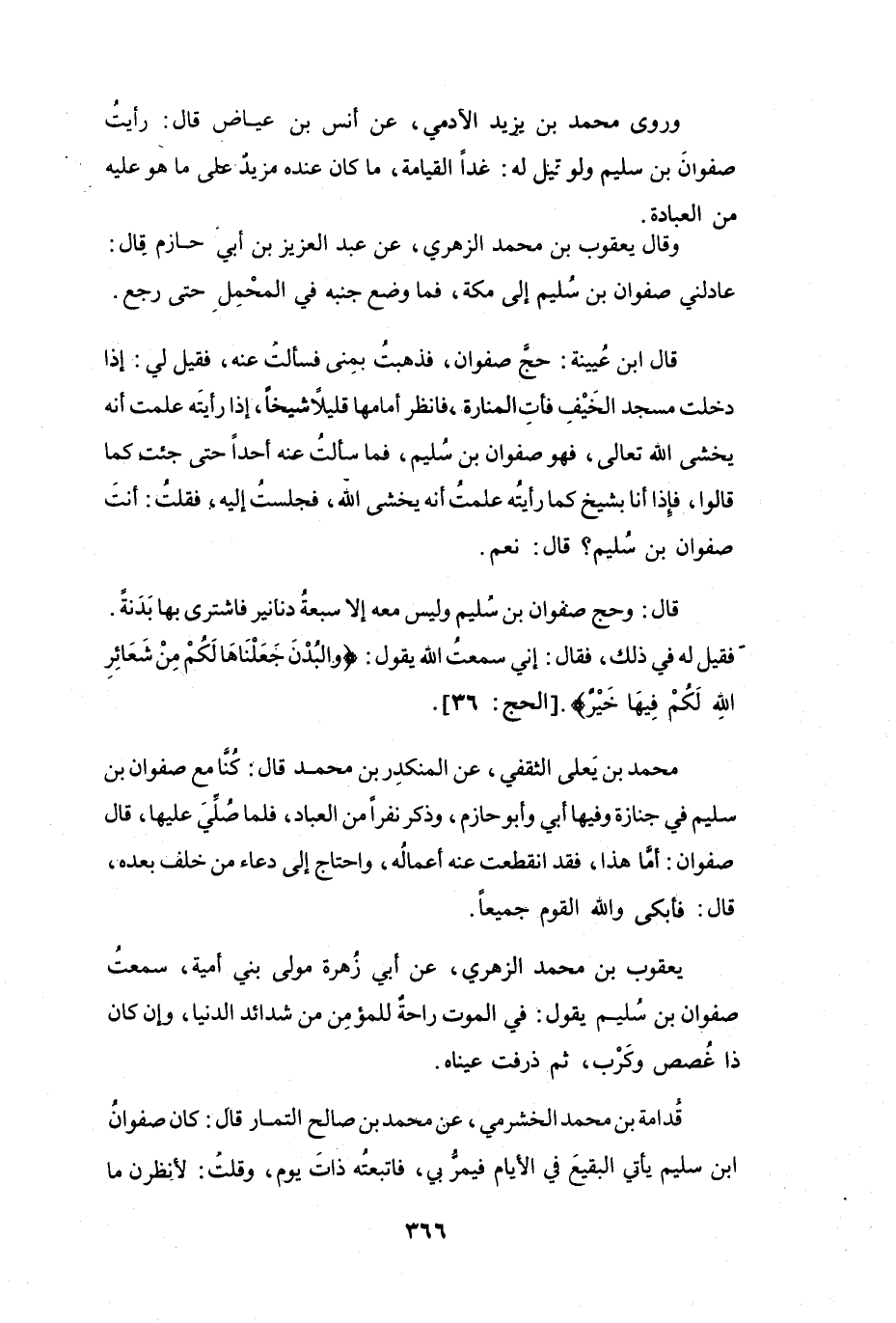 فَمَا سَأَلْتُ عَنْهُ أَحَداً حَتَّى جِئْتُ كَمَا قَالُوا، فَإِذَا أَنَا بِشَيْخٍ كَمَا رَأَيْتُه، عَلِمتُ أَنَّهُ يَخْشَى اللهَ، فَجَلَستُ إِلَيْهِ، فَقُلْتُ: أَنْتَ صَفْوَانُ بنُ سُلَيْمٍ؟