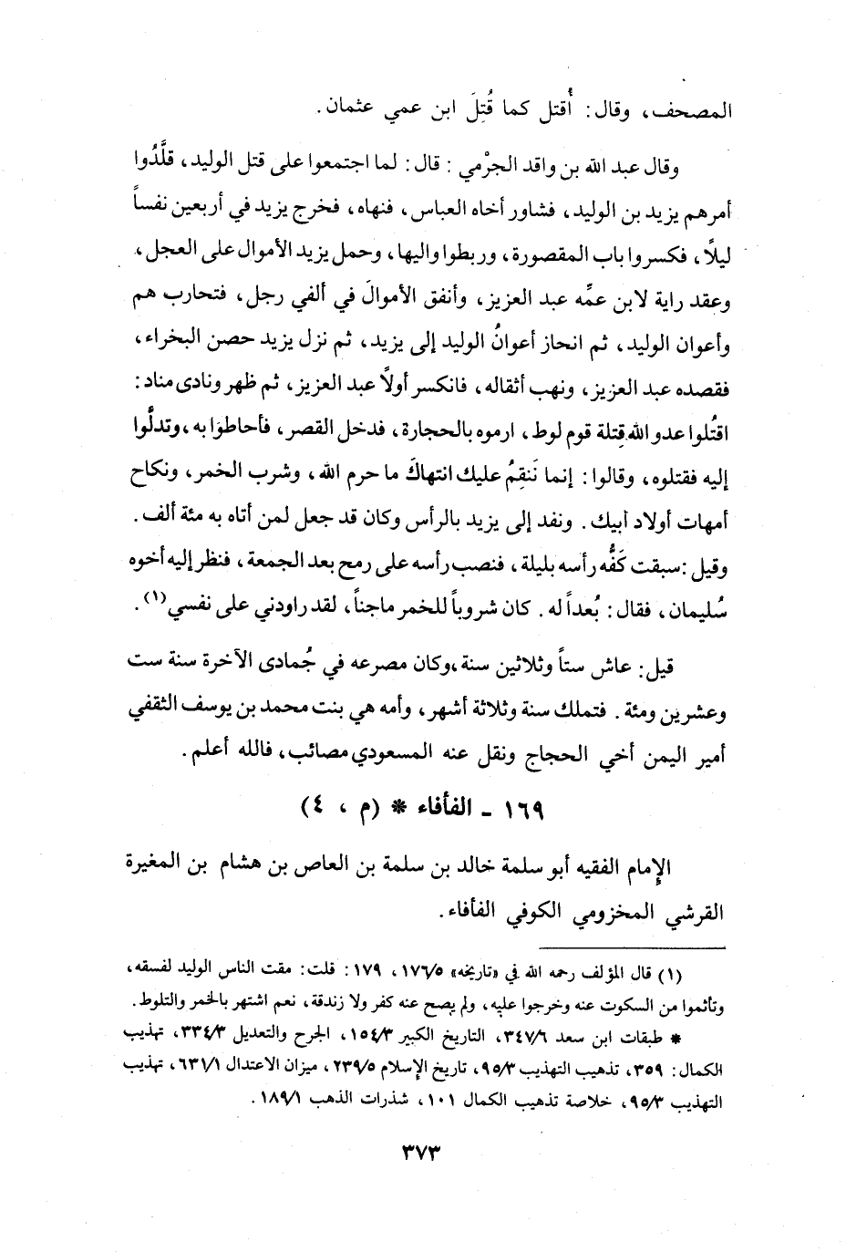 (1) قال المؤلف رحمه الله في " تاريخه " 5 / 176، 179: قلت: مقت الناس الوليد لفسقه، وتأثموا من السكوت عنه وخرجوا عليه، ولم يصح عنه كفر ولا زندقة، نعم اشتهر بالخمر والتلوط.