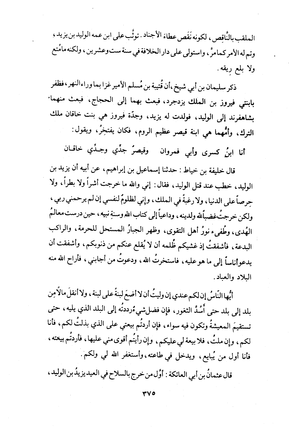 أَنَّ يَزِيْدَ بنَ الوَلِيْدِ خَطَبَ عِنْدَ قَتْلِ الوَلِيْدِ، فَقَالَ: إِنِّي -وَاللهِ- مَا خَرَجتُ أَشَراً وَلاَ بَطَراً، وَلاَ حِرصاً عَلَى الدُّنْيَا، وَلاَ رَغبَةً فِي المُلْكِ، وَإِنِّي لَظَلُوْمٌ لِنَفْسِي إِنْ لَمْ يَرَحْمْنِي رَبِّي، وَلَكِنْ خَرَجتُ غَضَباً للهِ وَلِدِيْنِه، وَدَاعِياً إِلَى كِتَابِ اللهِ وَسُنَّةِ نَبِيِّهِ حِيْنَ دَرَسَتْ مَعَالِمُ الهُدَى، وَطُفِئَ نُوْرُ أَهْلِ التَقْوَى، وَظَهَرَ الجَبَّارُ المُسْتَحِلُّ لِلْحُرْمَةِ، وَالرَّاكِبُ البِدْعَةَ، فَأَشفَقْتُ إِذْ غَشِيَكُم ظُلْمُه أَنْ لاَ يُقلِعَ عَنْكُم مِنْ ذُنُوْبِكُم، وَأَشفَقتُ أَنْ يَدْعُوَ أُنَاساً إِلَى مَا هُوَ عَلَيْهِ، فَاسْتَخرْتُ اللهَ، وَدَعَوْتُ مَنْ أَجَابَنِي، فَأَرَاحَ اللهُ مِنْهُ البِلاَدَ وَالعِبَادَ.