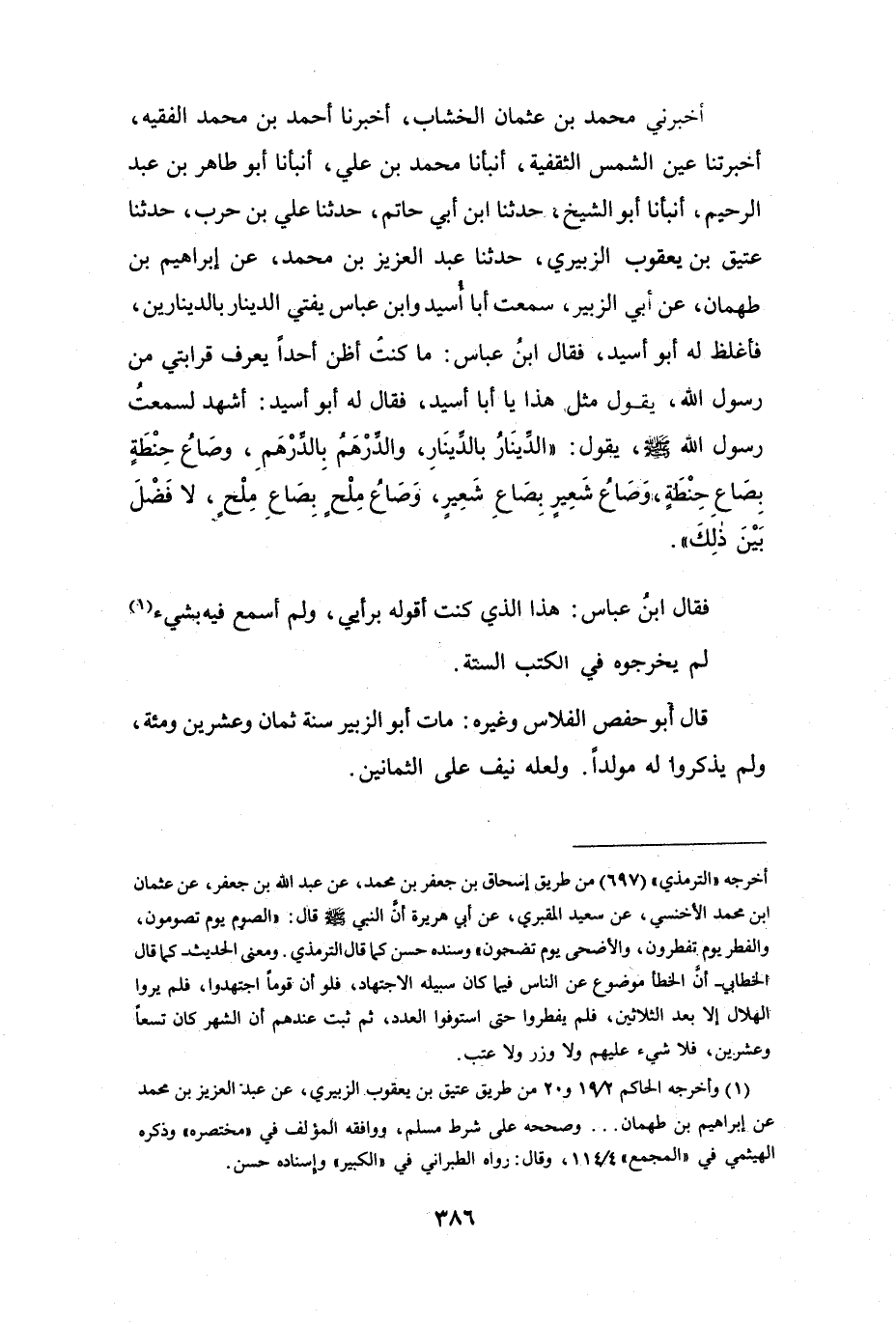 أَخْبَرَنِي مُحَمَّدُ بنُ عُثْمَانَ الخَشَّابُ، أَخْبَرَنَا أَحْمَدُ بنُ مُحَمَّدٍ الفَقِيْهُ، أَخْبَرَتْنَا عَيْنُ الشَّمْسِ الثَّقَفِيَّةُ، أَنْبَأَنَا مُحَمَّدُ بنُ عَلِيٍّ، أَنْبَأَنَا أَبُو طَاهِرٍ بنُ عَبْدِ الرَّحِيْمِ، أَنْبَأَنَا أَبُو الشَّيْخِ، حَدَّثَنَا ابْنُ أَبِي حَاتِمٍ، حَدَّثَنَا عَلِيُّ بنُ حَرْبٍ، حَدَّثَنَا عَتِيْقُ بنُ يَعْقُوْبَ الزُّبَيْرِيُّ، حَدَّثَنَا عَبْدُ العَزِيْزِ بنُ مُحَمَّدٍ، عَنْ إِبْرَاهِيْمَ بنِ طَهْمَانَ، عَنْ أَبِي الزُّبَيْرِ، سَمِعْتُ أَبَا أُسَيْدٍ وَابْنُ عَبَّاسٍ يُفْتِي الدِّيْنَارَ بِالدِّيْنَارَيْنِ، فَأَغلَظَ لَهُ أَبُو أُسَيْدٍ.