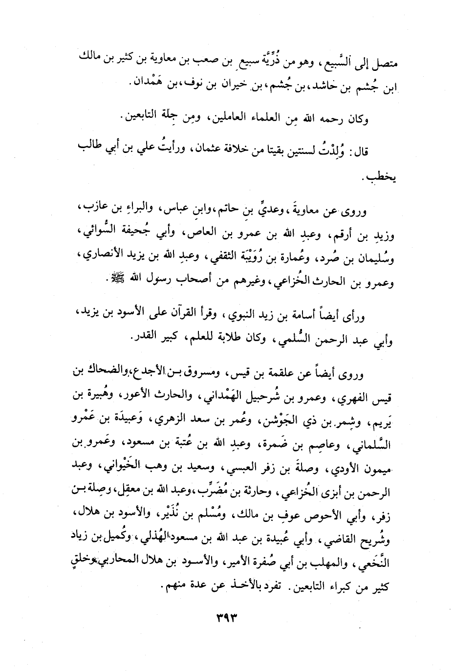 وَرَوَى أَيْضاً عَنْ: عَلْقَمَةَ بنِ قَيْسٍ، وَمَسْرُوْقِ بنِ الأَجْدَعِ، وَالضَّحَّاكِ بنِ قَيْسٍ الفِهْرِيِّ، وَعَمْرِو بنِ شُرَحْبِيْلَ الهَمْدَانِيِّ، وَالحَارِثِ الأَعْوَرِ، وَهُبَيْرَةَ بنِ يَرِيْمَ، وَشِمْرِ بنِ ذِيْ الجَوْشَنِ، وَعُمَرَ بنِ سَعْدٍ الزُّهْرِيِّ، وَعَبِيْدَةَ بنِ عَمْرٍو السَّلْمَانِيِّ، وَعَاصِمِ بنِ ضَمْرَةَ، وَعَبْدِ اللهِ بنِ عُتْبَةَ بنِ مَسْعُوْدٍ، وَعَمْرِو بنِ مَيْمُوْنٍ الأَوْدِيِّ، وَصِلَةَ بنِ زُفَرَ العَبْسِيِّ، وَسَعِيْدِ بنِ وَهْبٍ الخَيْوَانِيِّ، وَعَبْدِ الرَّحْمَنِ بنِ أَبْزَى الخُزَاعِيِّ، وَحَارِثَةَ بنِ مُضَرِّبٍ، وَعَبْدِ اللهِ بنِ مَعْقِلٍ، وَصِلَةَ بنِ زُفَرَ، وَأَبِي الأَحْوَصِ عَوْفِ بنِ مَالِكٍ، وَمُسْلِمِ بنِ نُذَيْرٍ، وَالأَسْوَدِ بنِ هِلاَلٍ، وَشُرَيْحٍ القَاضِي، وَأَبِي عُبَيْدَةَ بنِ عَبْدِ اللهِ بنِ مَسْعُوْدٍ الهُذَلِيِّ، وَكُمَيْلِ بنِ زِيَادٍ النَّخَعِيِّ، وَالمُهَلَّبِ بنِ أَبِي صُفْرَةَ الأَمِيْرِ، وَالأَسْوَدِ بنِ هِلاَلٍ المُحَارِبِيِّ، وَخَلْقٍ كَثِيْرٍ مِنْ كُبَرَاءِ التَّابِعِيْنَ.
