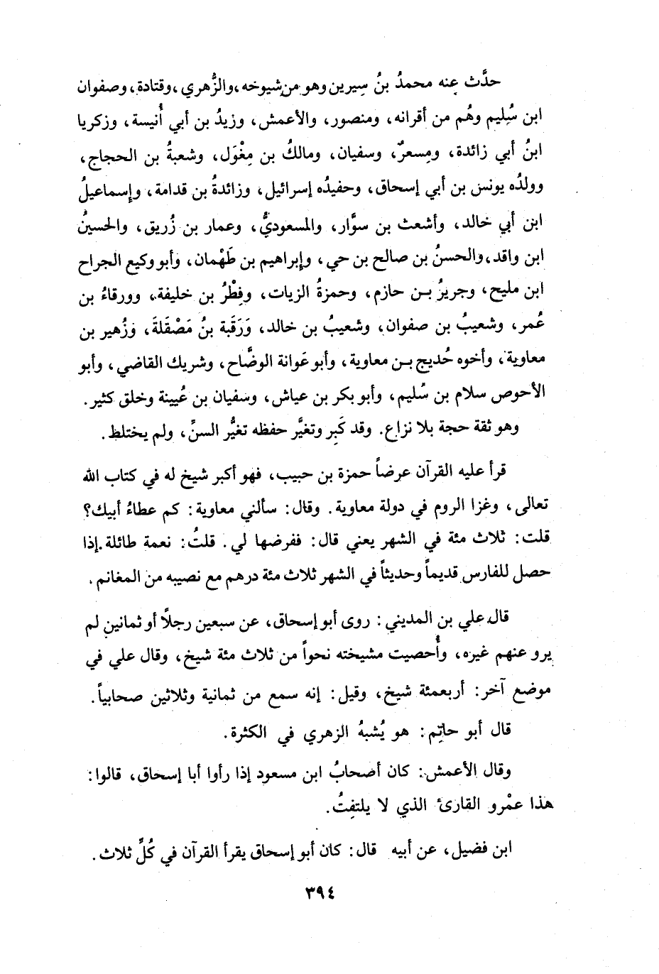 ابْنُ فُضَيْلٍ، عَنْ أَبِيْهِ، قَالَ: كَانَ أَبُو إِسْحَاقَ يَقْرَأُ القُرْآنَ فِي كُلِّ ثَلاَثٍ.