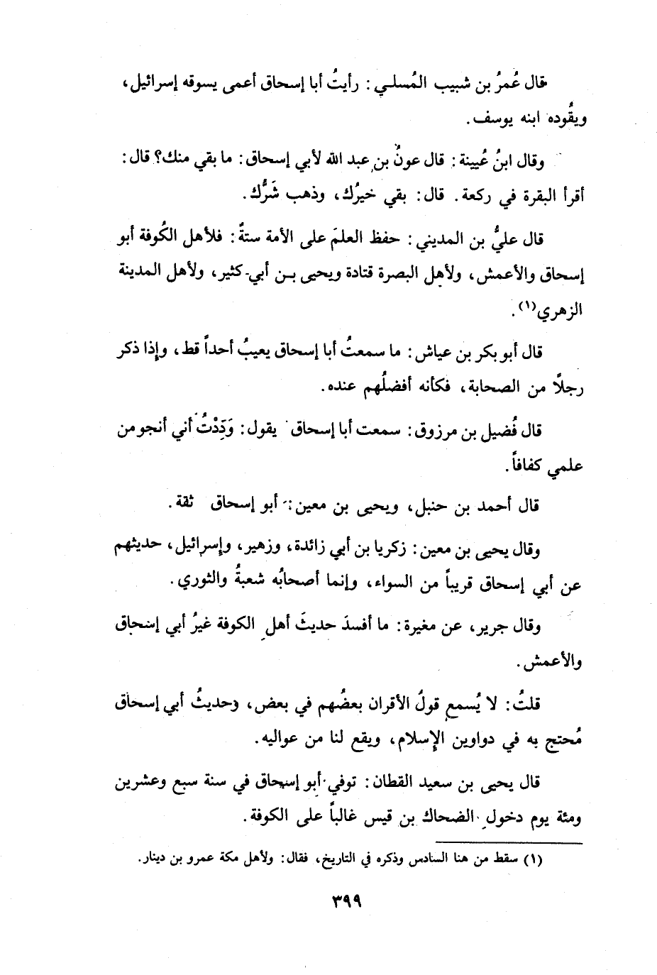 قَالَ أَحْمَدُ بنُ حَنْبَلٍ، وَيَحْيَى بنُ مَعِيْنٍ: أَبُو إِسْحَاقَ ثِقَةٌ.