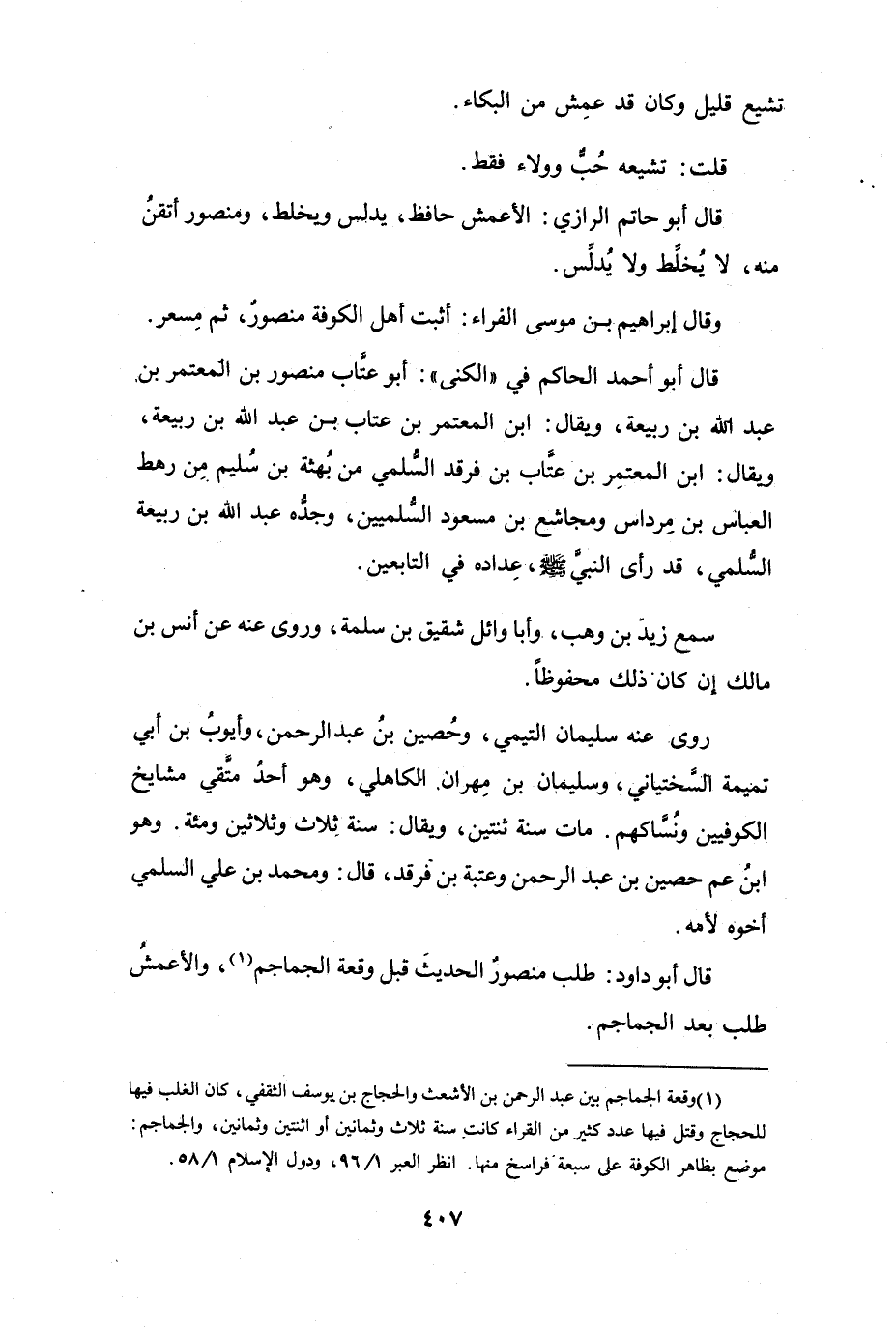 قَالَ أَبُو دَاوُدَ: طَلبَ مَنْصُوْرٌ الحَدِيْثَ قَبْل وَقْعَةِ الجَمَاجِمِ (1) ، وَالأَعْمَشُ طَلَبَ بَعْدَ الجَمَاجِمِ.