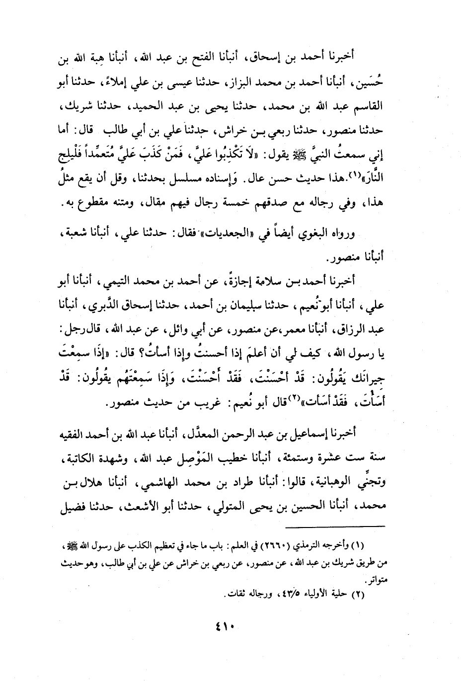 أَخْبَرَنَا أَحْمَدُ بنُ إِسْحَاقَ، أَنْبَأَنَا الفَتْحُ بنُ عَبْدِ اللهِ، أَنْبَأَنَا هِبَةُ اللهِ بنُ حُسَيْنٍ، أَنْبَأَنَا أَحْمَدُ بنُ مُحَمَّدٍ البَزَّازُ، حَدَّثَنَا عِيْسَى بنُ عَلِيٍّ إِمْلاَءً، حَدَّثَنَا أَبُو القَاسِمِ عَبْدُ اللهِ بنُ مُحَمَّدٍ، حَدَّثَنَا يَحْيَى بنُ عَبْدِ الحَمَيْدِ، حَدَّثَنَا شَرِيْكٌ، حَدَّثَنَا مَنْصُوْرٌ، حَدَّثَنَا رِبْعِيُّ بنُ خِرَاشٍ، حَدَّثَنَا عَلِيُّ بنُ أَبِي طَالِبٍ، قَالَ: