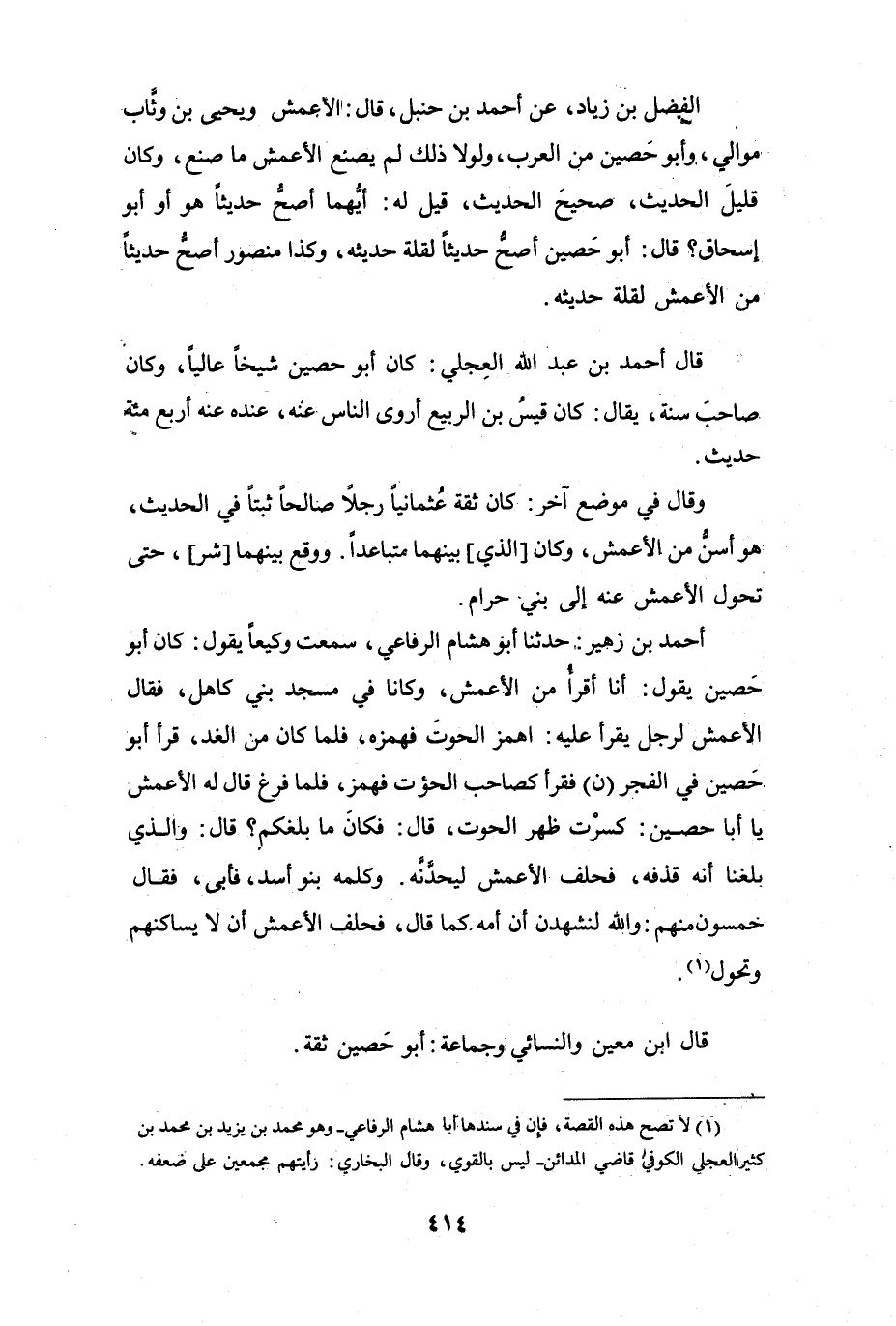 الأَعْمَشُ، وَيَحْيَى بنُ وَثَّابٍ مَوَالِي، وَأَبُو حَصِيْنٍ مِنَ العَرَبِ، وَلَوْلاَ ذَلِكَ لَمْ يَصْنَعِ الأَعْمَشُ مَا صَنَعَ، وَكَانَ قَلِيْلَ الحَدِيْثِ، صَحِيْحَ الحَدِيْثِ.