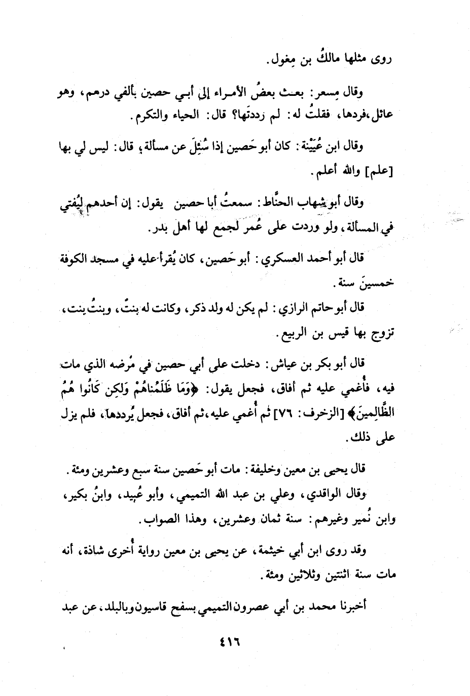 قَالَ أَبُو بَكْرٍ بنُ عَيَّاشٍ: دَخَلْتُ عَلَى أَبِي حَصِيْنٍ فِي مَرَضِهِ الَّذِي مَاتَ فِيْهِ، فَأُغْمِيَ عَلَيْهِ، ثُمَّ أَفَاقَ، فَجَعَلَ يَقُوْلُ: {وَمَا ظَلَمْنَاهُم وَلَكِنْ كَانُوا هُمُ الظَّالِمِيْنَ} [الزُّخْرُفُ: 76] .