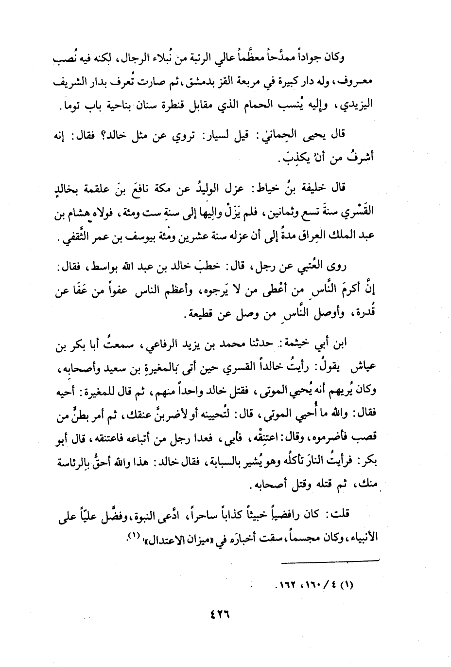 رَأَيْتُ خَالِداً القَسْرِيَّ حِيْنَ أَتَى بِالمُغِيْرَةِ بنِ سَعِيْدٍ وَأَصْحَابِه، وَكَانَ يُرِيهِم أَنَّهُ يُحْيِى المَوْتَى، فَقَتَلَ خَالِدٌ وَاحِداً مِنْهُم، ثُمَّ قَالَ لِلْمُغِيْرَةِ: أَحْيِهِ.