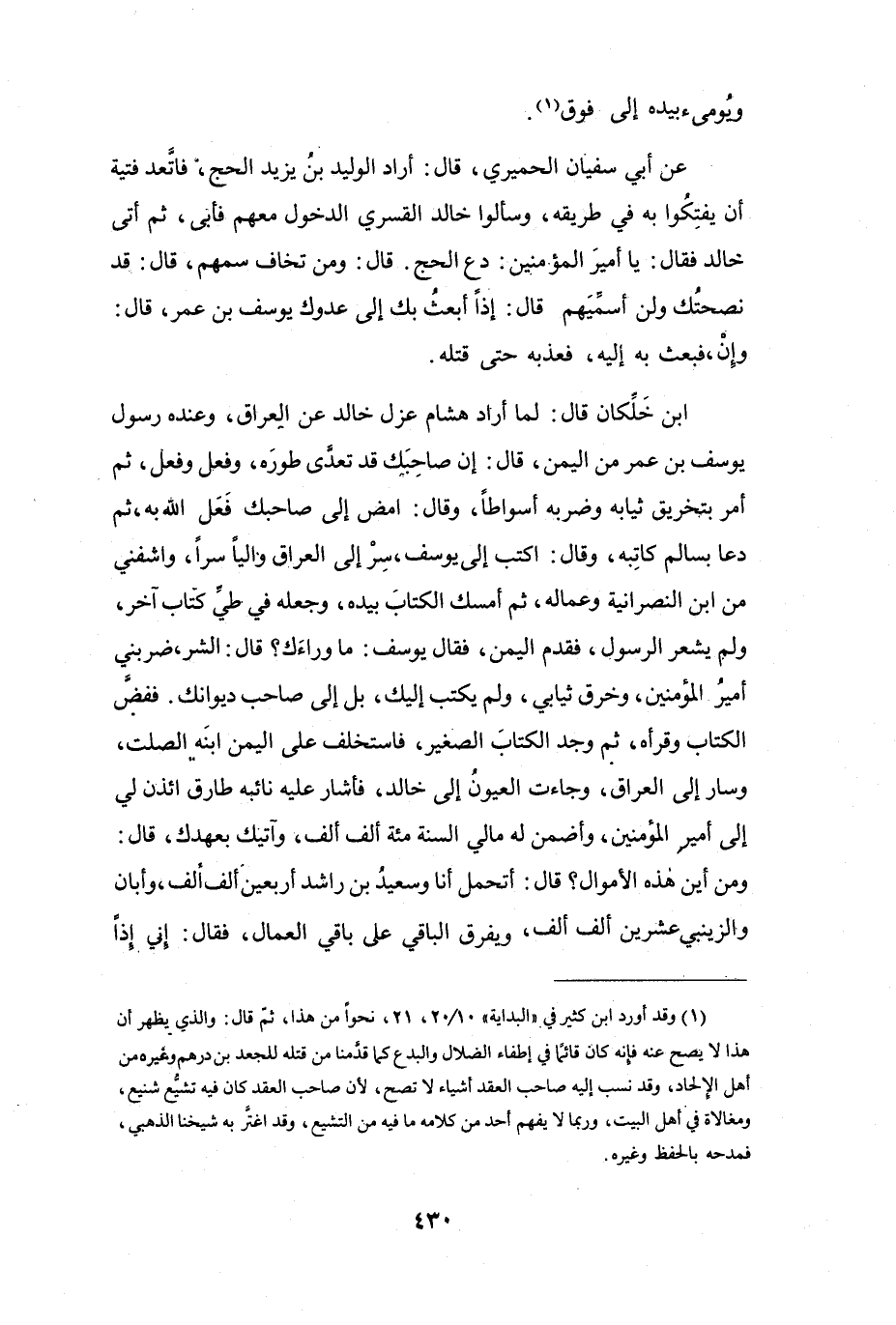 ابْنُ خَلِّكَانَ، قَالَ: لَمَّا أَرَادَ هِشَامٌ عَزلَ خَالِدٍ عَنِ العِرَاقِ، وَعِنْدَهُ رَسُوْلُ يُوْسُفَ بنِ عُمَرَ مِنَ اليَمَنِ، قَالَ: إِنَّ صَاحِبَكَ قَدْ تَعَدَّى طَوْرَه، وَفَعَلَ، وَفَعَلَ.
