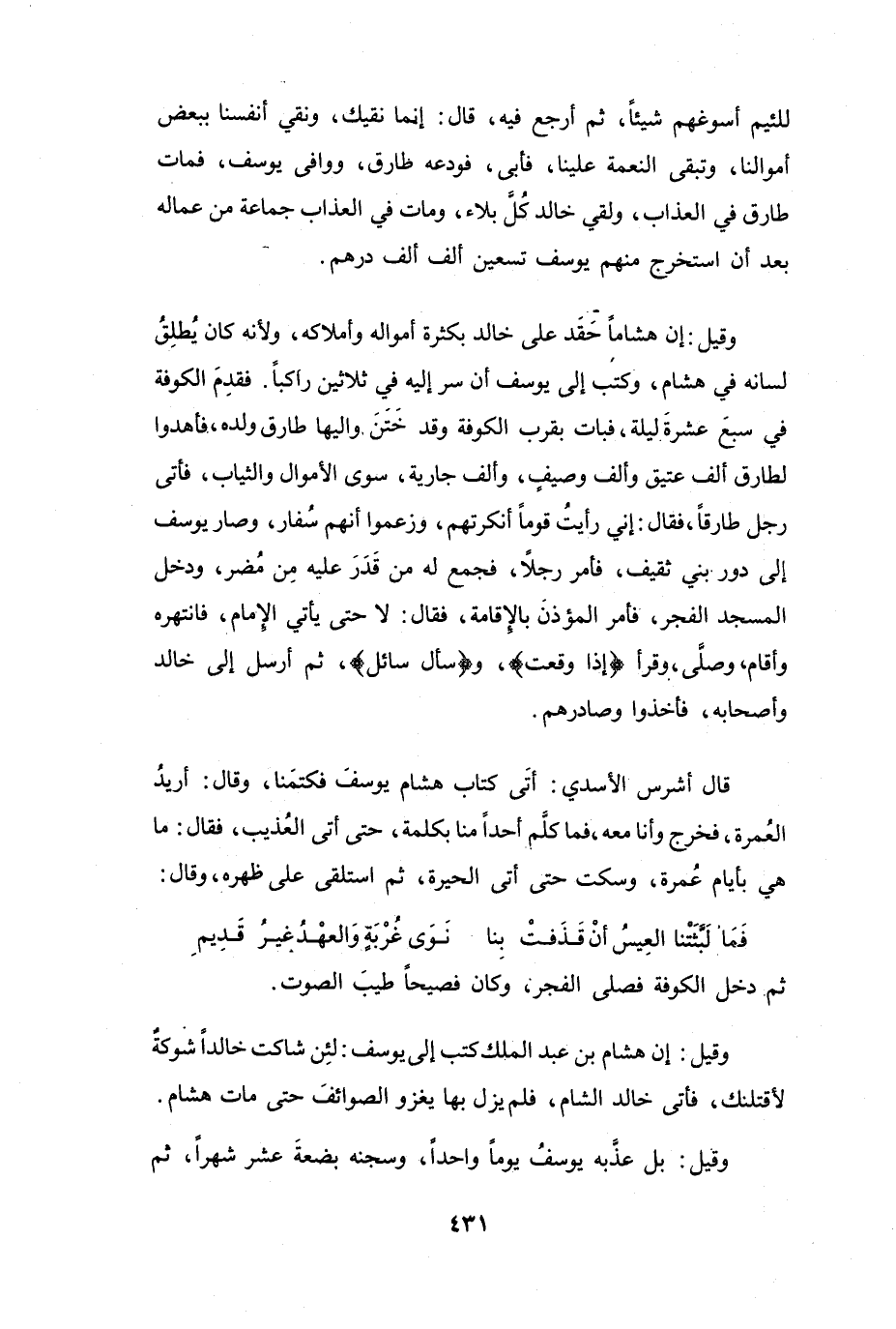 فَأَبَى، فَوَدَّعَه طَارِقٌ، وَوَافَى يُوْسُفَ، فَمَاتَ طَارِقٌ فِي العَذَابِ، وَلَقِيَ خَالِدٌ كُلَّ بَلاَءٍ، وَمَاتَ فِي العَذَابِ جَمَاعَةٌ مِنْ عُمَّالِه بَعْدَ أَن اسْتَخرَجَ مِنْهُم يُوْسُفُ تِسْعِيْنَ أَلفَ أَلفِ دِرْهَمٍ.