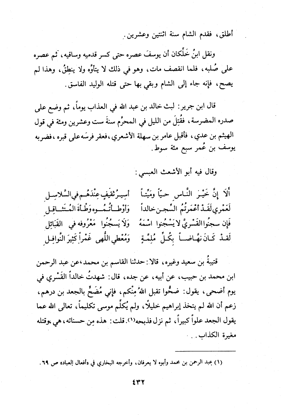 شَهِدتُ خَالِداً القَسْرِيَّ فِي يَوْم أَضْحَى يَقُوْلُ: ضَحُّوا تَقبَّلَ اللهُ مِنْكُم، فَإِنِّي مُضَحٍّ بِالجَعْدِ بنِ دِرْهَمٍ، زَعَمَ أَنَّ اللهَ لَمْ يَتَّخِذْ إِبْرَاهِيْمَ خَلِيْلاً، وَلَمْ يُكَلِّمْ مُوْسَى تَكلِيماً، تَعَالَى اللهُ عَمَّا يَقُوْلُ الجَعْدُ عُلُوّاً كَبِيْراً.