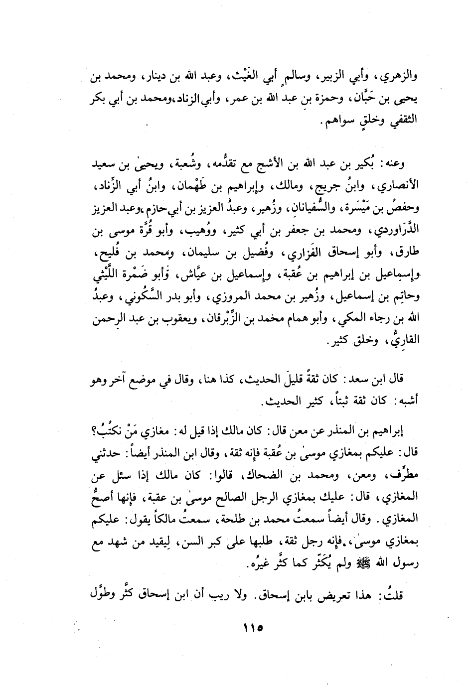 وَقَالَ أَيْضاً: سَمِعْتُ مُحَمَّدَ بنَ طَلْحَةَ، سَمِعْتُ مَالِكاً يَقُوْلُ: عَلَيْكُم بِـ (مَغَازِي مُوْسَى) ، فَإِنَّهُ رَجُلٌ ثِقَةٌ، طَلبهَا عَلَى كِبَرِ السِّنِّ، لِيُقَيِّدَ مَنْ شَهِدَ مَعَ رَسُوْل اللهِ -صَلَّى اللَّهُ عَلَيْهِ وَسَلَّمَ- وَلَمْ يُكثِّرْ كَمَا كَثَّرَ غَيْرُهُ.