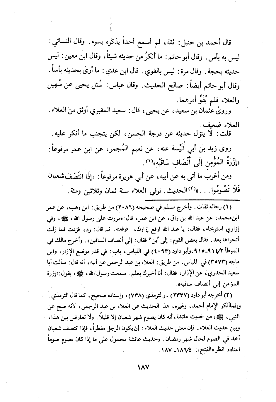 سَعِيْدٌ المَقْبُرِيُّ أَوثَقُ مِنَ العَلاَءِ، العَلاَءُ ضَعِيْفٌ.