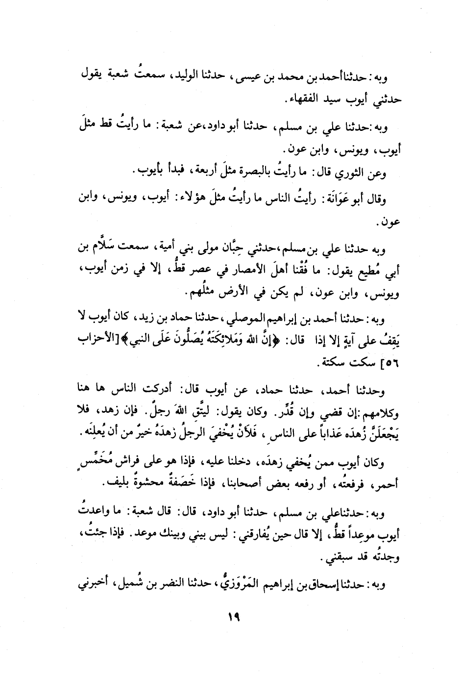 كَانَ أَيُّوْبُ لاَ يَقِفُ عَلَى آيَةٍ إِلاَّ إِذَا قَالَ: {إِنَّ اللهَ وَمَلاَئِكَتَهُ يُصَلُّوْنَ عَلَى النَّبِيِّ} [الأَحْزَابُ: 56] ، سَكَتَ سَكتَةً.