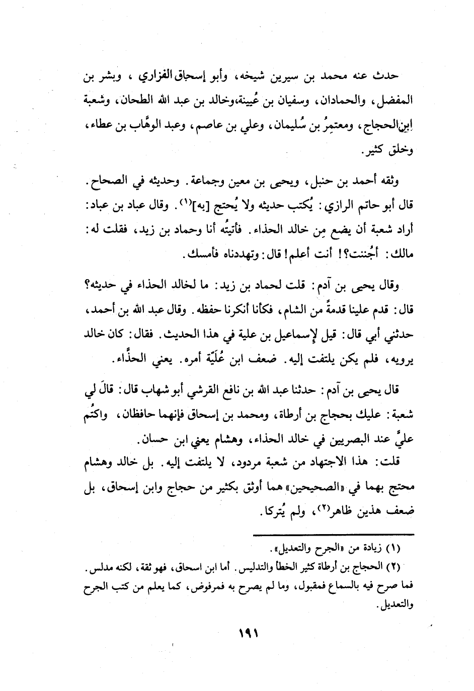 قُلْتُ: هَذَا الاجْتِهَادُ مِنْ شُعْبَةَ مَرْدُوْدٌ، لاَ يُلْتَفَتُ إِلَيْهِ، بَلْ خَالِدٌ وَهِشَامٌ مُحْتَجٌّ بِهِمَا فِي (الصَّحِيْحَيْنِ) ، هُمَا أَوْثَقُ بِكَثِيْرٍ مِنْ حَجَّاجٍ، وَابْنِ إِسْحَاقَ، بَلْ ضَعْفُ هَذَيْنِ ظَاهِرٌ (2) ، وَلَمْ يُترَكَا.