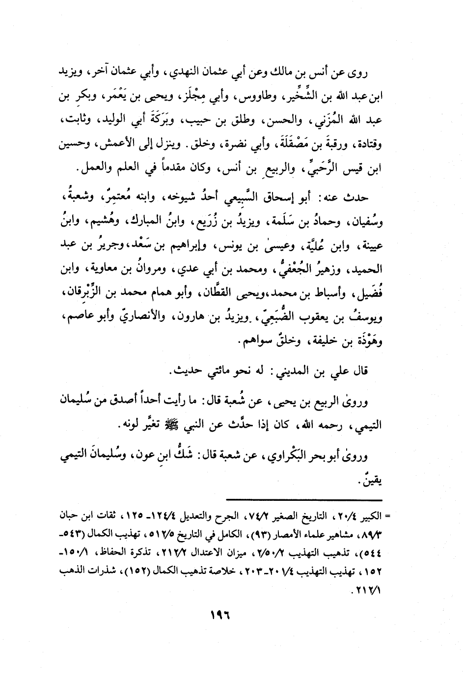 = الكبير 4 / 20، التاريخ الصغير 2 / 74، الجرح والتعديل 4 / 124 - 125، ثقات ابن حبان 3 / 89، مشاهير علماء الأمصار (93) ، الكامل في التاريخ 5 / 512، تهذيب الكمال (543 - 544) ، تذهيب التهذيب 2 / 50 / 2، ميزان الاعتدال 2 / 212، تذكرة الحفاظ، 1 / 150 - 152، تهذيب التهذيب 4 / 201 - 203، خلاصة تذهيب الكمال (152) ، شذرات الذهب 1 / 212.