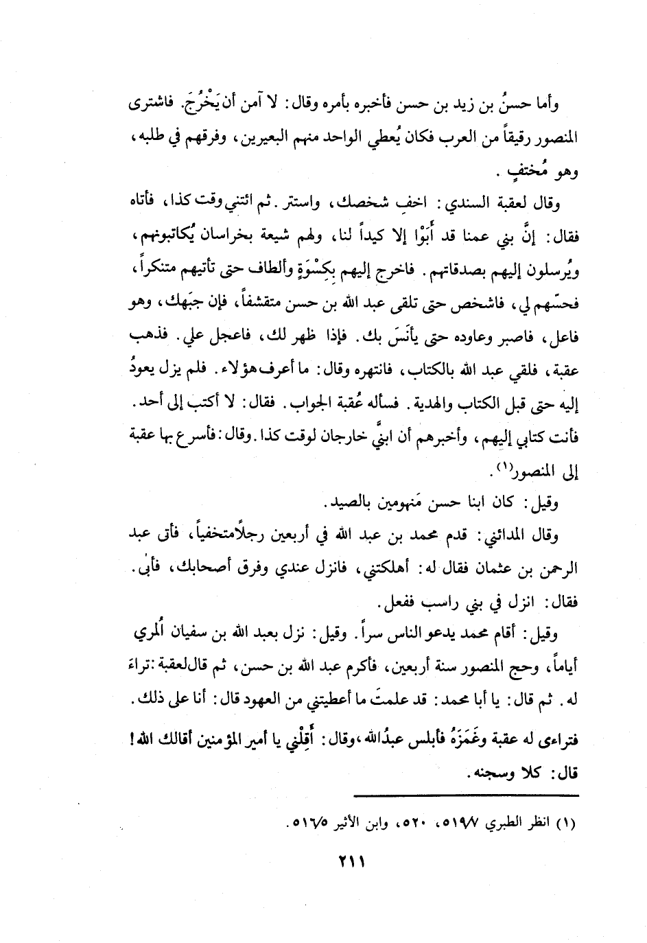 فَأَتَاهُ، فَقَالَ: إِنَّ بَنِي عَمِّنَا قَدْ أَبَوْا إِلاَّ كَيداً لَنَا، وَلَهُم شِيْعَةٌ بِخُرَاسَانَ يُكَاتِبُونَهُم، وَيُرسِلُوْنَ إِلَيْهِم بِصَدَقَاتِهِم، فَاخرُجْ إِلَيْهِم بِكِسْوَةٍ وَأَلطَافٍ، حَتَّى تَأْتِيَهُم مُتَنَكِّراً، فَحسَّهُم لِي، فَاشْخَصْ حَتَّى تَلقَى عَبْدَ اللهِ بنَ حَسَنٍ مُتَقَشِّفاً، فَإِنْ جَبَهَكَ، وَهُوَ فَاعِلٌ، فَاصْبِرْ، وَعَاوِدْهُ حَتَّى يَأنَسَ بِكَ، فَإِذَا ظَهَرَ لَكَ، فَاعجَلْ عَلَيَّ.