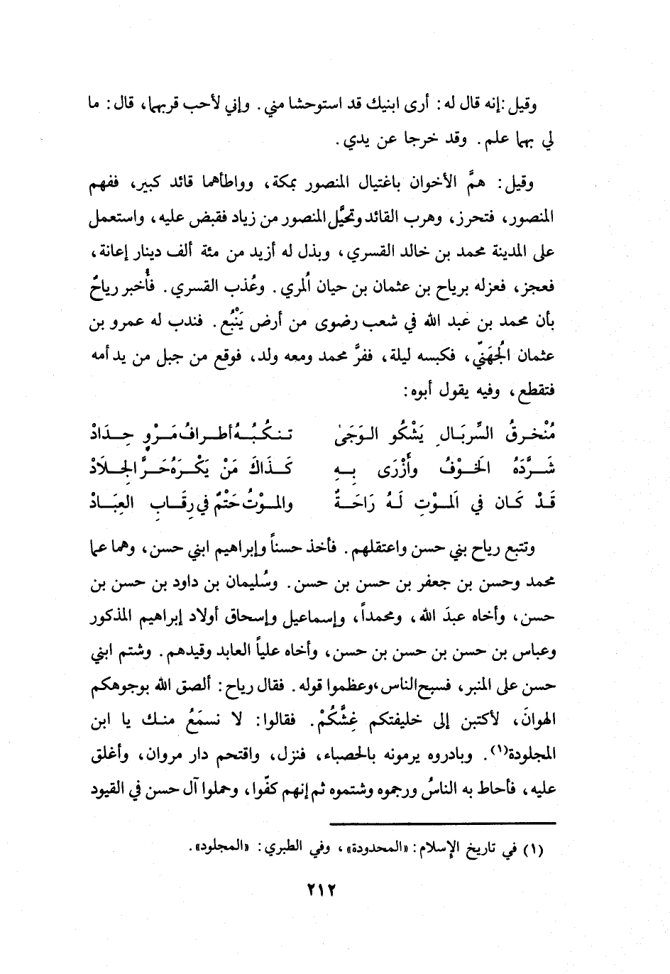 فَأَخَذَ: حَسَناً وَإِبْرَاهِيْمَ ابْنَيْ حَسَنٍ - وَهُمَا عَمَّا مُحَمَّدٍ - وَحَسَنَ بنَ جَعْفَرِ بنِ حَسَنِ بنِ حَسَنٍ، وَسُلَيْمَانَ بنَ دَاوُدَ بنِ حَسَنِ بنِ حَسَنٍ، وَأَخَاهُ؛ عَبْدَ اللهِ، وَمُحَمَّداً، وَإِسْمَاعِيْلَ وَإِسْحَاقَ أَوْلاَدَ إِبْرَاهِيْمَ المَذْكُوْرِ، وَعَبَّاسَ بنَ حَسَنِ بنِ حَسَنِ بنِ حَسَنٍ، وَأَخَاهُ؛ عَلِيّاً العَابِدَ، وَقَيَّدَهُم.