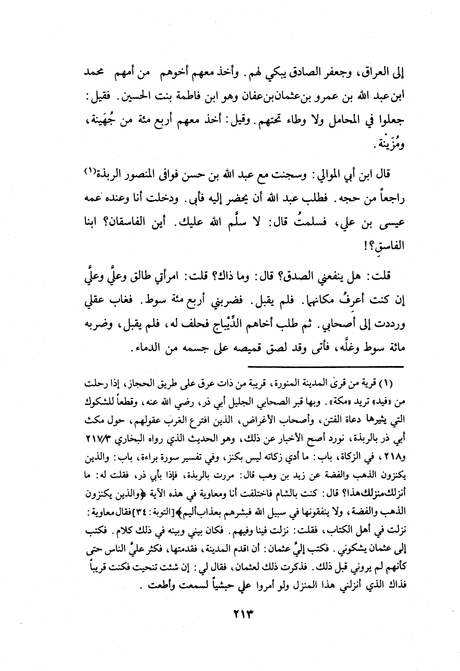 أبي ذر بالربذة، نورد أصح الاخبار عن ذلك، وهو الحديث الذي رواه البخاري 3 / 217 و218، في الزكاة، باب: ما أدي زكاته ليس بكنز، وفي تفسير سورة براءة، باب: والذين يكنزون الذهب والفضة عن زيد بن وهب قال: مررت بالربذة، فإذا بأبي ذر، فقلت له: ما أنزلك منزلك هذا؟ قال: كنت بالشام فاختلفت أنا ومعاوية في هذه الآية (والذين يكنزون الذهب والفضة، ولا ينفقونها في سبيل الله فبشرهم بعذاب أليم) [التوبة: 34] فقال معاوية: نزلت في أهل الكتاب، فقلت: نزلت فينا وفيهم.