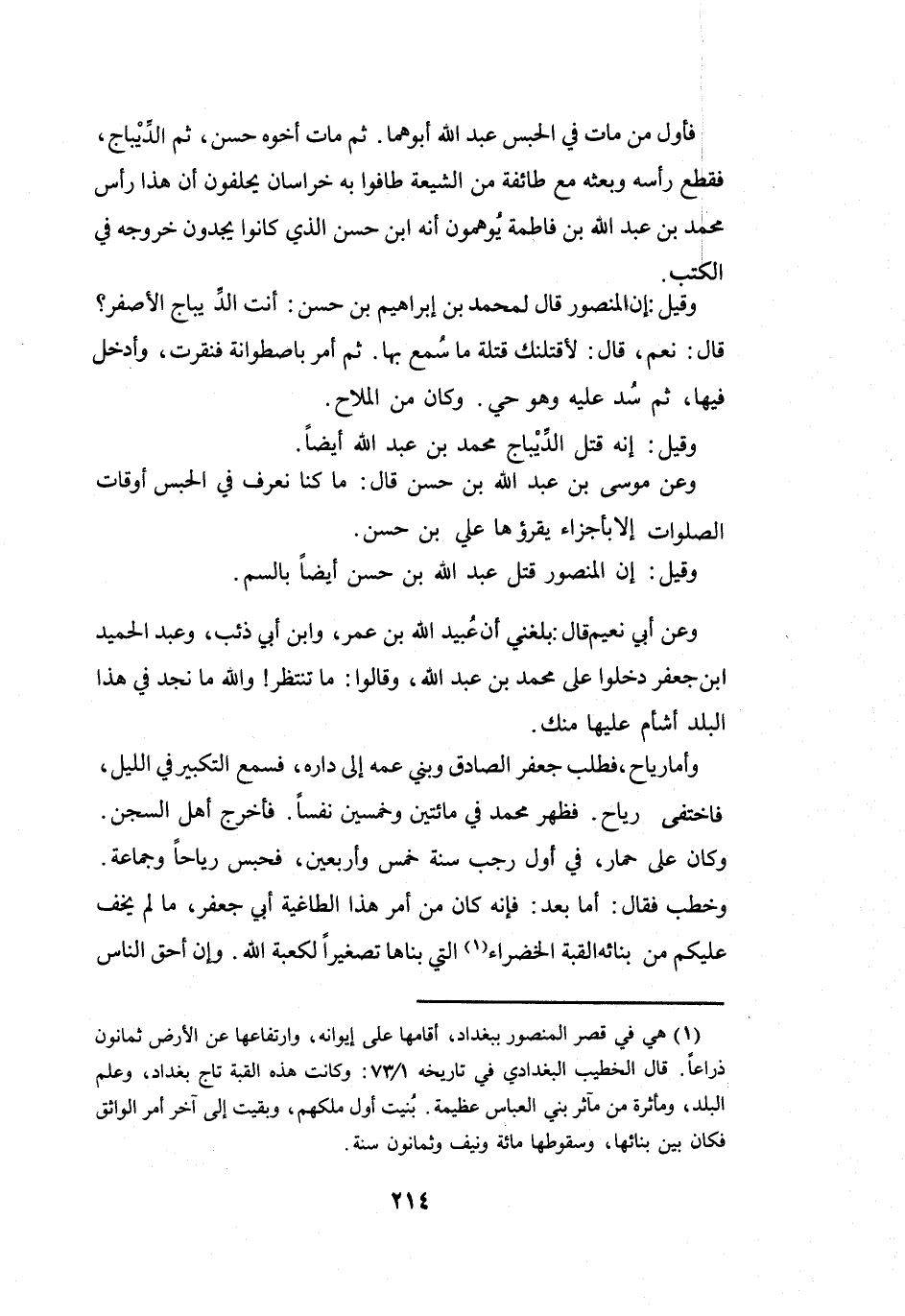 فَأَوَّلُ مَنْ مَاتَ فِي الحَبسِ عَبْدُ اللهِ أَبُوْهُمَا، ثُمَّ مَاتَ أَخُوْهُ حَسَنٌ، ثُمَّ الدِّيْبَاجُ، فَقَطَعَ رَأْسَه، وَبَعَثَه مَعَ طَائِفَةٍ مِنَ الشِّيْعَةِ، طَافُوا بِهِ خُرَاسَانَ، يَحلِفُوْنَ أَنَّ هَذَا رَأْسُ مُحَمَّدِ بنِ عَبْدِ اللهِ ابْنِ فَاطِمَةَ، يُوْهِمُوْنَ أَنَّهُ ابْنُ حَسَنٍ الَّذِي كَانُوا يَجِدُوْنَ خُرُوْجَه فِي الكُتُبِ.