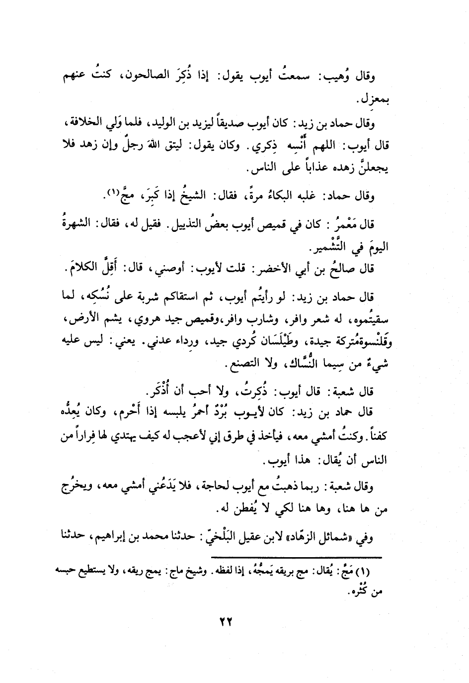 قَالَ حَمَّادُ بنُ زَيْدٍ: كَانَ لأَيُّوْبَ بُرْدٌ أَحْمَرُ يَلْبَسَه إِذَا أَحرَمَ، وَكَانَ يُعِدُّه كَفَناً، وَكُنْتُ أَمشِي مَعَهُ، فَيَأْخُذُ فِي طُرُقٍ، إِنِّي لأَعجَبُ لَهُ كَيْفَ يَهتَدِي لَهَا، فِرَاراً مِنَ النَّاسِ أَنْ يُقَالَ: هَذَا أَيُّوْبُ.